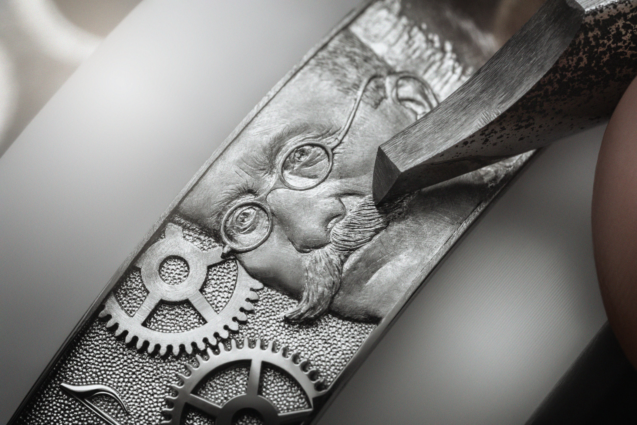 Сплит-стрелка хронографа изготовлена из белого золота. Второй циферблат выполнен в том же стиле, что и первый. Фоном идет синяя эмаль с той же гравировкой, что и на часовой шкале. Показания отображаются на титановых дисках.