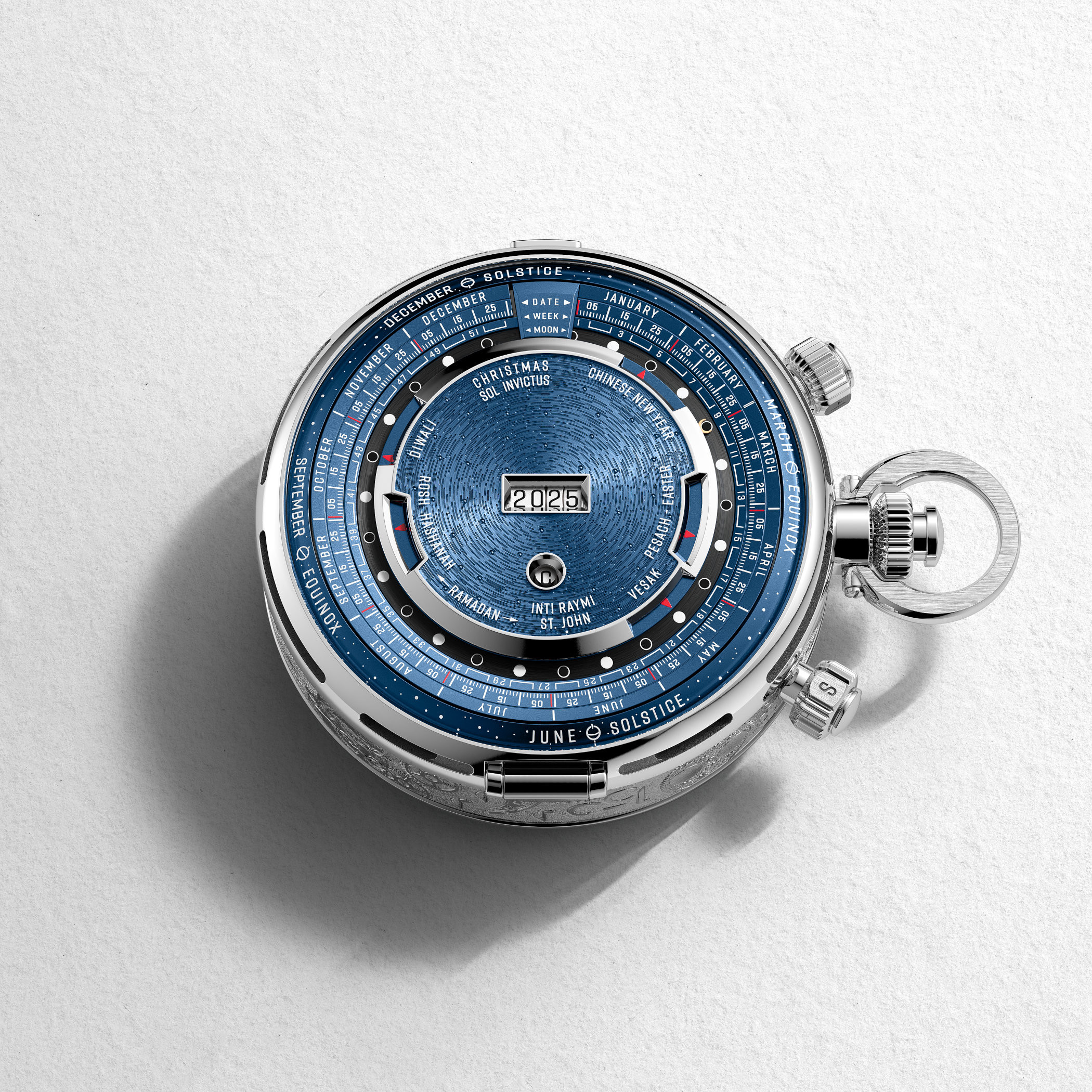 Главная особенность этой модели – универсальный календарь, расположенный внутри задней крышки корпуса и работающий независимо от основного механизма. В качестве ориентира он включает в себя григорианский календарь с 8 усложнениями и 17 индикаторами и представляет панорамный обзор астрономических и культурных циклов.