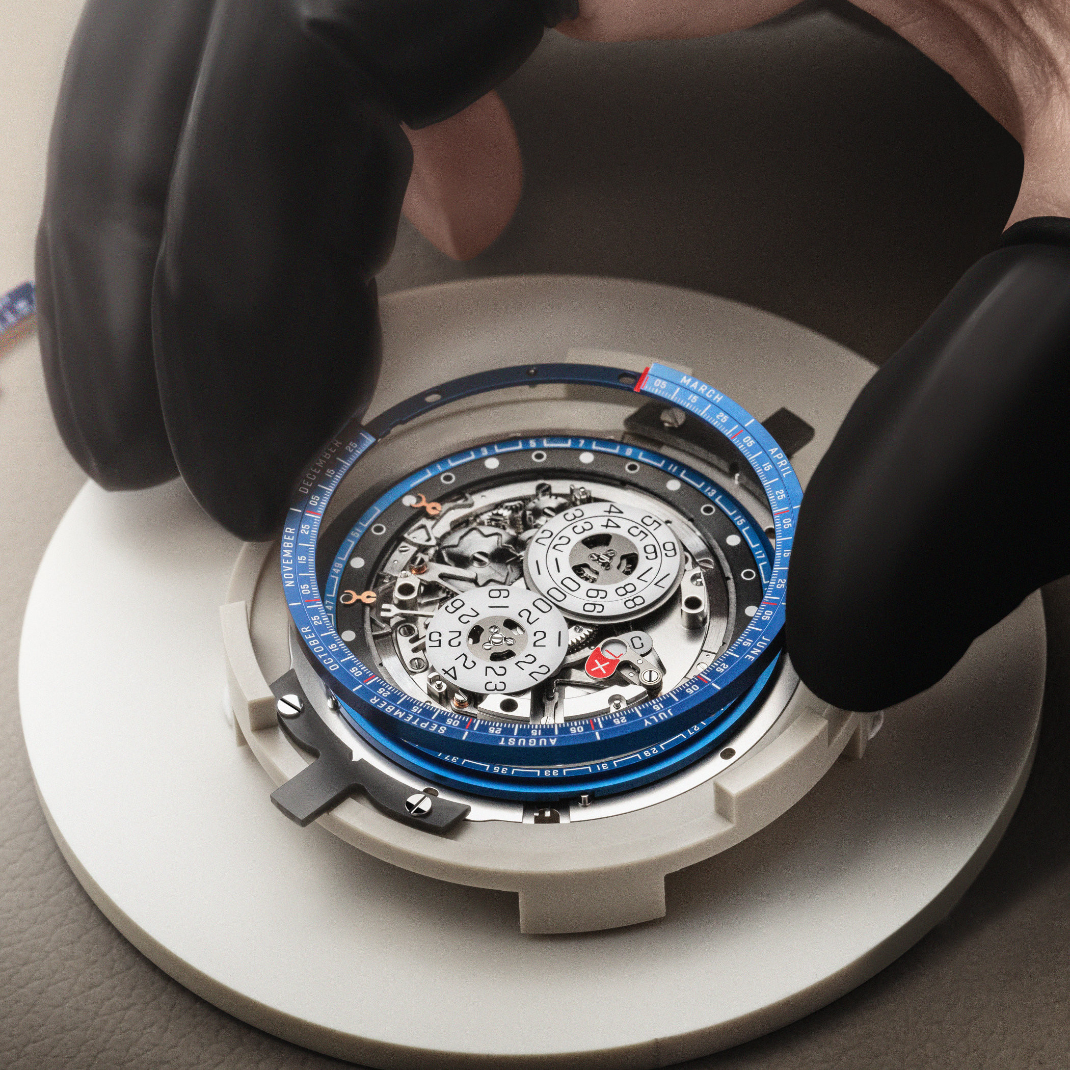 Основной циферблат часов выполнен из 18-каратного белого золота и покрыт полупрозрачной синей эмалью Grand Feu. Римские цифры на часовой шкале выгравированы вручную. То же самое можно сказать о стрелках из розового золота, которые перекликаются с мостом парящего турбийона и обеспечивают отличную читаемость за счет четкого контраста с синим фоном циферблата.