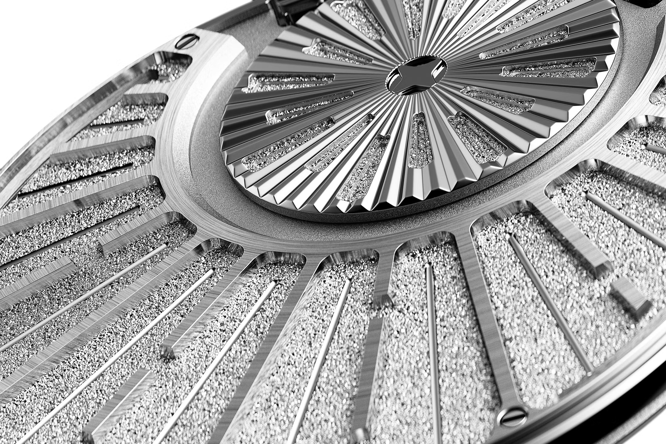 Незаметная кнопка в положении «6 часов» открывает скрытую заднюю крышку. В отличие от большинства карманных часов она открывается на 180 градусов, демонстрируя механизм и универсальный вечный календарь. Внутренняя сторона задней крышки служит сапфировой декой, улучшая акустические характеристики модели. Корпус украшен ручной гравировкой с изображением портретов основателей дома Audemars Piguet и эмблемы в честь 150-летия бренда.