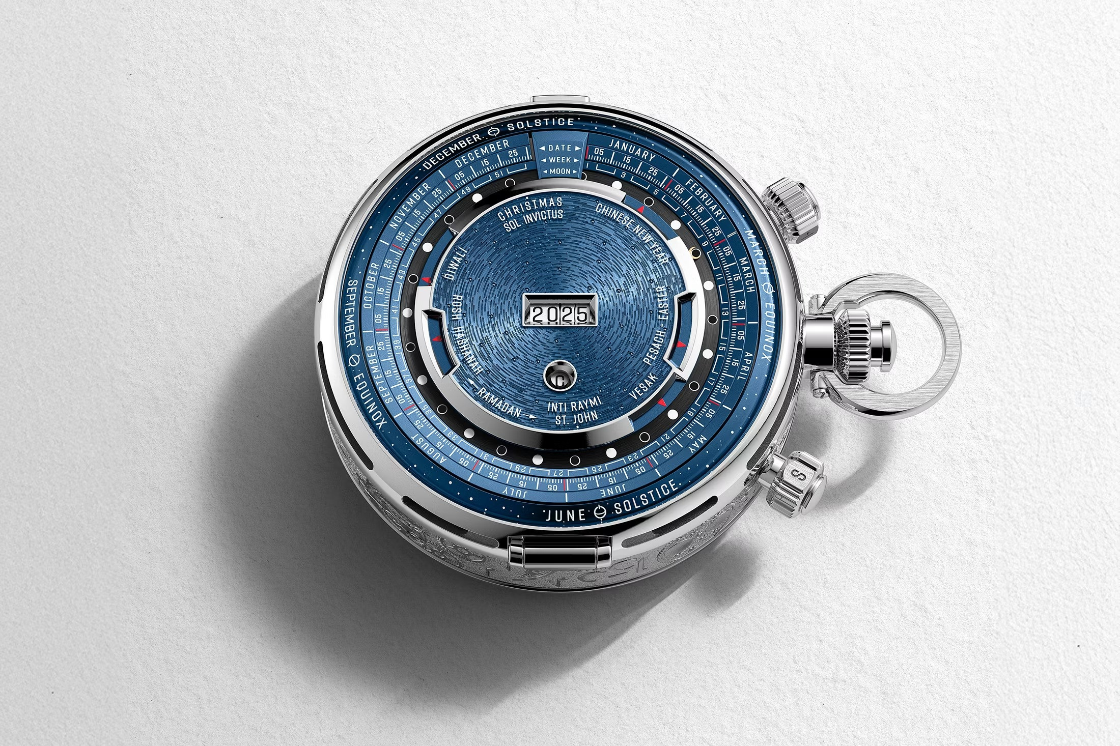 Кнопка в положении «6 часов» открывает заднюю крышку, на которой расположены индикации универсального вечного календаря. Последние включают в себя информацию не только по григорианскому, но и по китайскому лунно-солнечному, исламскому и еврейскому календарям. Подробнее об этих часах мы расскажем в отдельном обзоре.