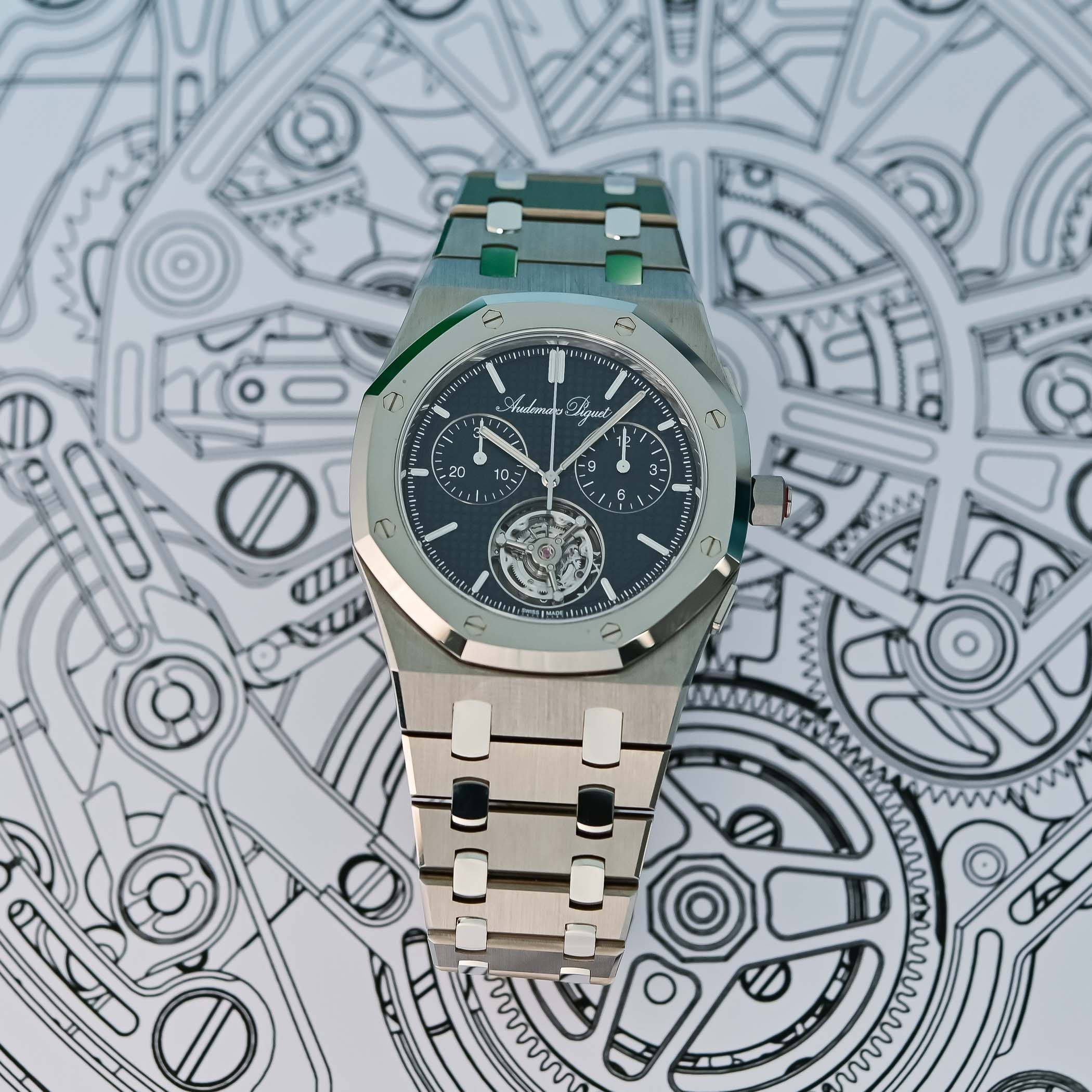 Прежде всего, новинка сочетает в себе парящий турбийон и хронограф с функцией flyback. При этом часы сохраняют пропорции Royal Oak Jumbo Ref. 16202ST, не меняя ни толщину, ни силуэт (39 х 8,1 мм). Корпус изготовлен из титана и инновационного металлического стекла Bulk Metallic Glass, что обеспечивает баланс легкости, прочности и блеска.