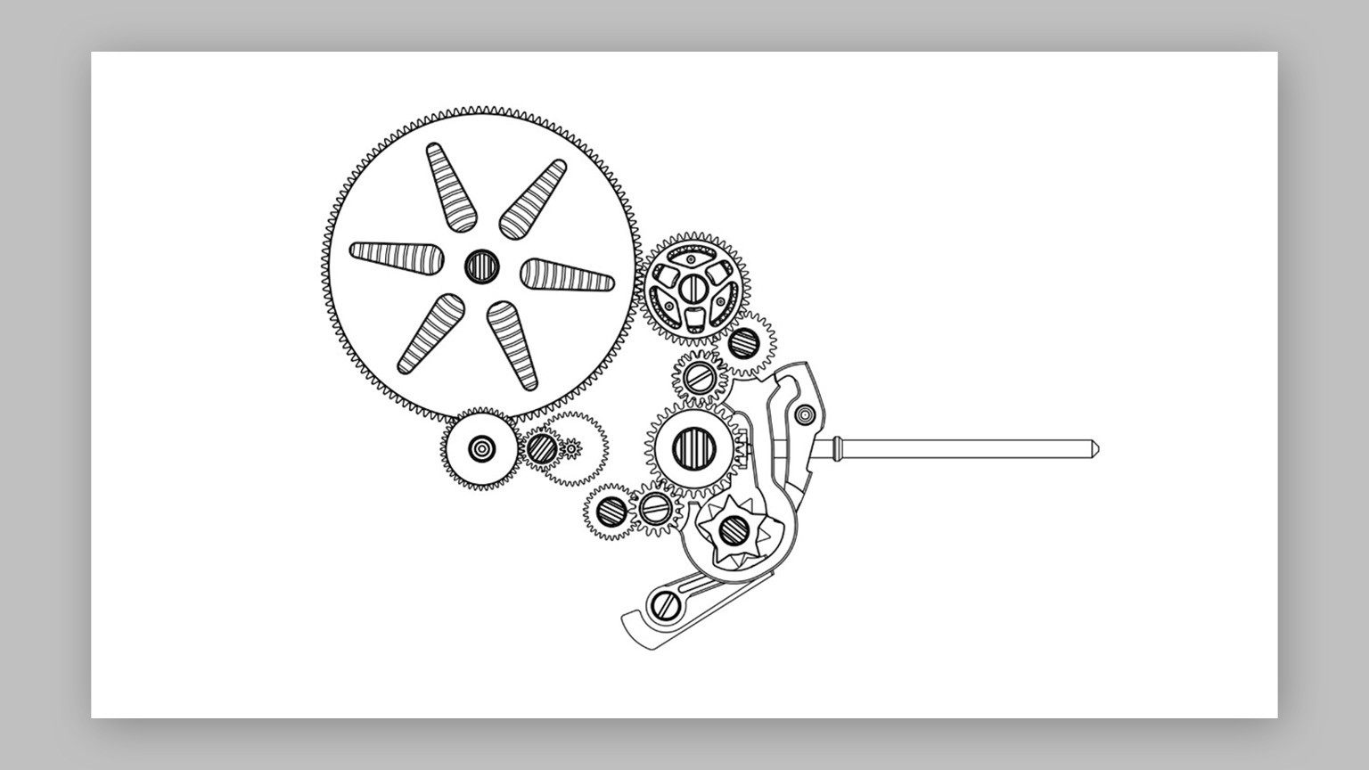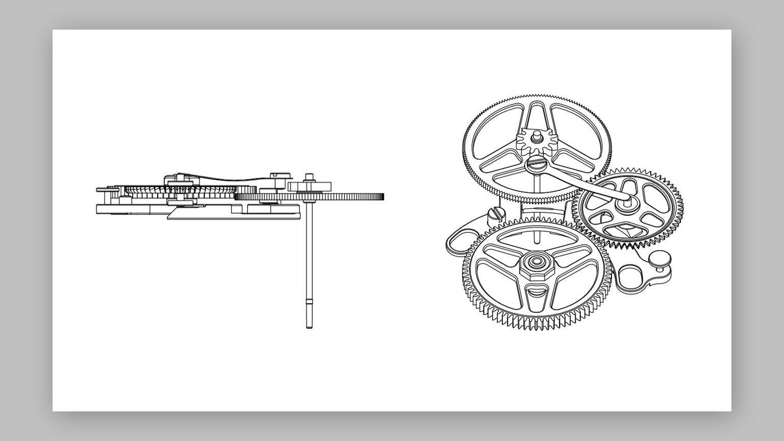 В этой модели вместо кулачков использована система реек и шестеренок, которые позволяют сбрасывать показания хронографа и обеспечивают функцию антивибрации. Идея заключается в том, что механизм накапливает энергию и использует ее для сброса стрелок. На выходе это дает более плавное и точное взаимодействие с кнопками хронографа.