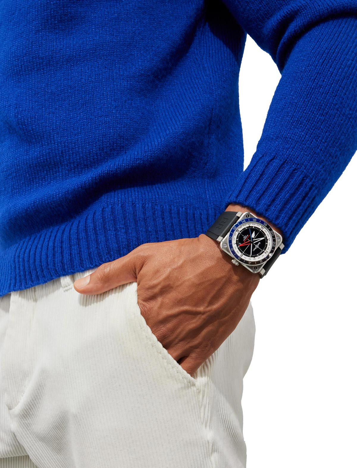 Компания Bell&Ross представила новую модель, в которой объединила GMT-индикацию и функцию компаса. Часы оснащены алюминиевым безелем с двухцветной 24-часовой шкалой. Синяя часть шкалы показывает дневное время, черная – вечернее и ночное время. Сама шкала позволяет считывать время во втором часовом поясе по стандартной часовой стрелке, а время в третьем часовом поясе – по стрелке GMT.