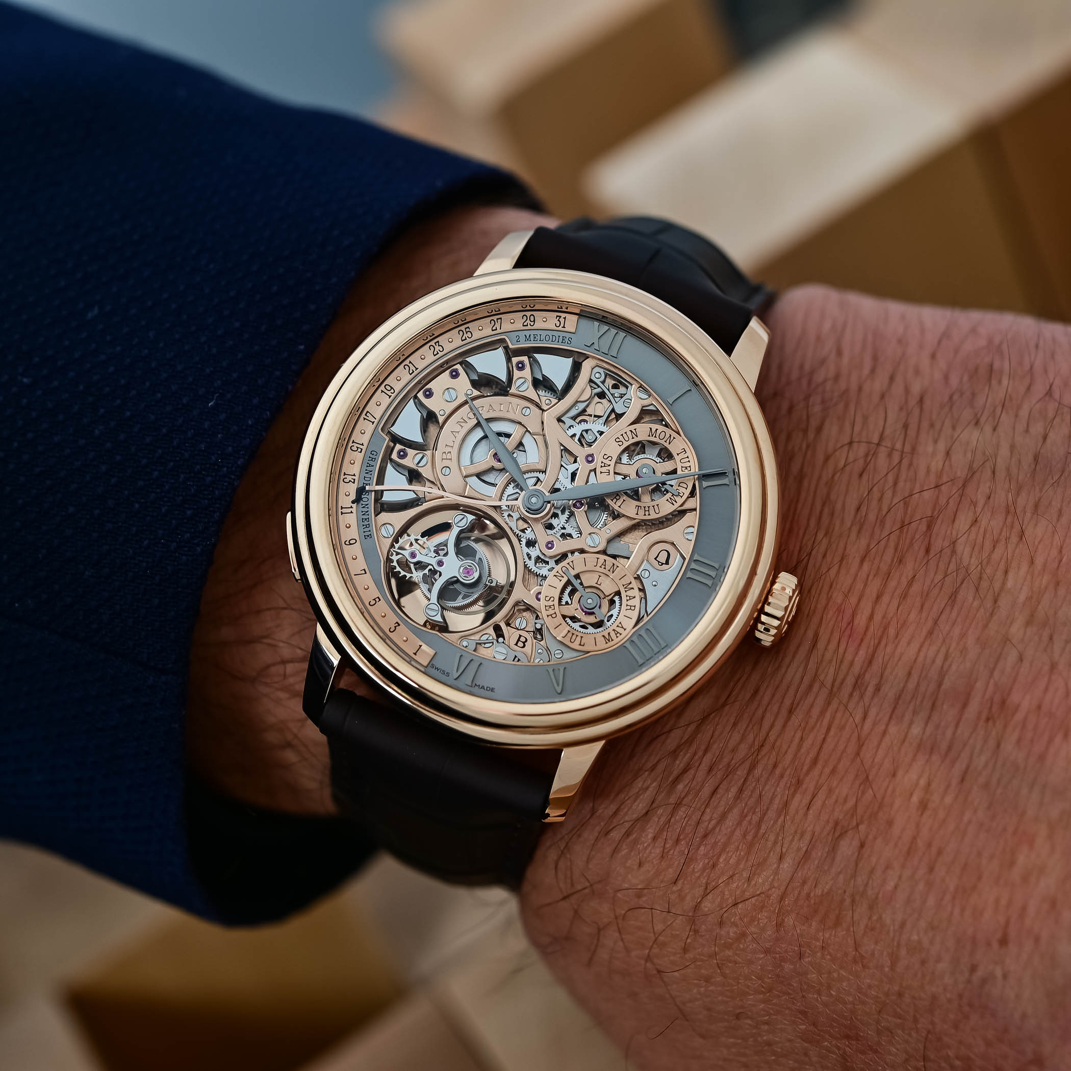 Гонги в механизме боя имеют квадратное поперечное сечение. У каждого из гонгов оно свое, чтобы механизм мог озвучивать разные ноты. Протестировав разные материалы, в Blancpain решили сделать гонги из розового золота, что неудивительно. Именно этот металл чаще всего признают лучшим для ключевых компонентов механизма акустической индикации.