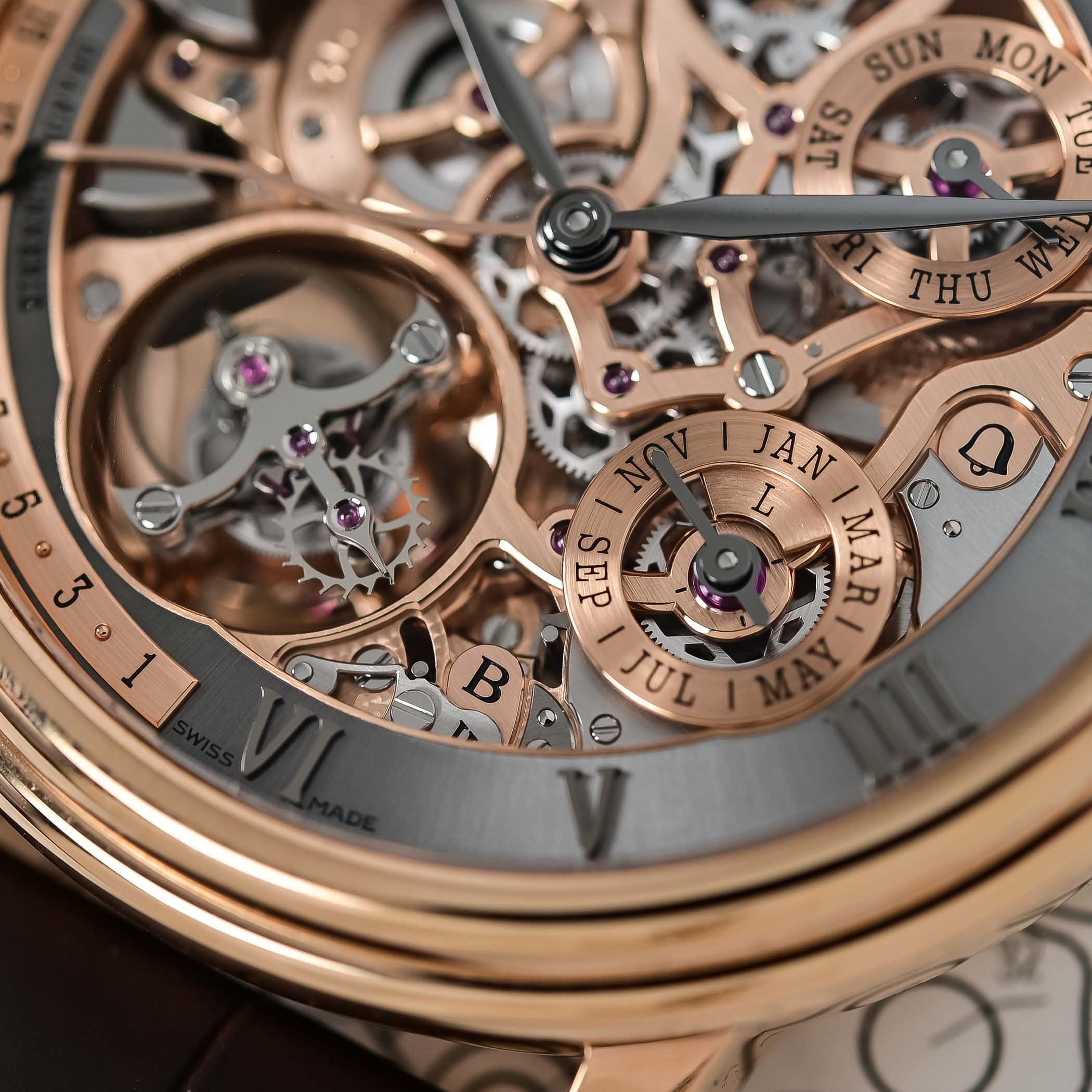 Ползунок у отметки «9 часов» переключает механизм между режимами большого боя, малого боя и беззвучным режимом. Этот же ползунок позволяет активировать механизм минутного репетира для отзванивания времени по требованию. Чтобы отслеживать, в каком режиме работают часы в конкретный момент, на циферблате предусмотрены буквенные индикаторы.