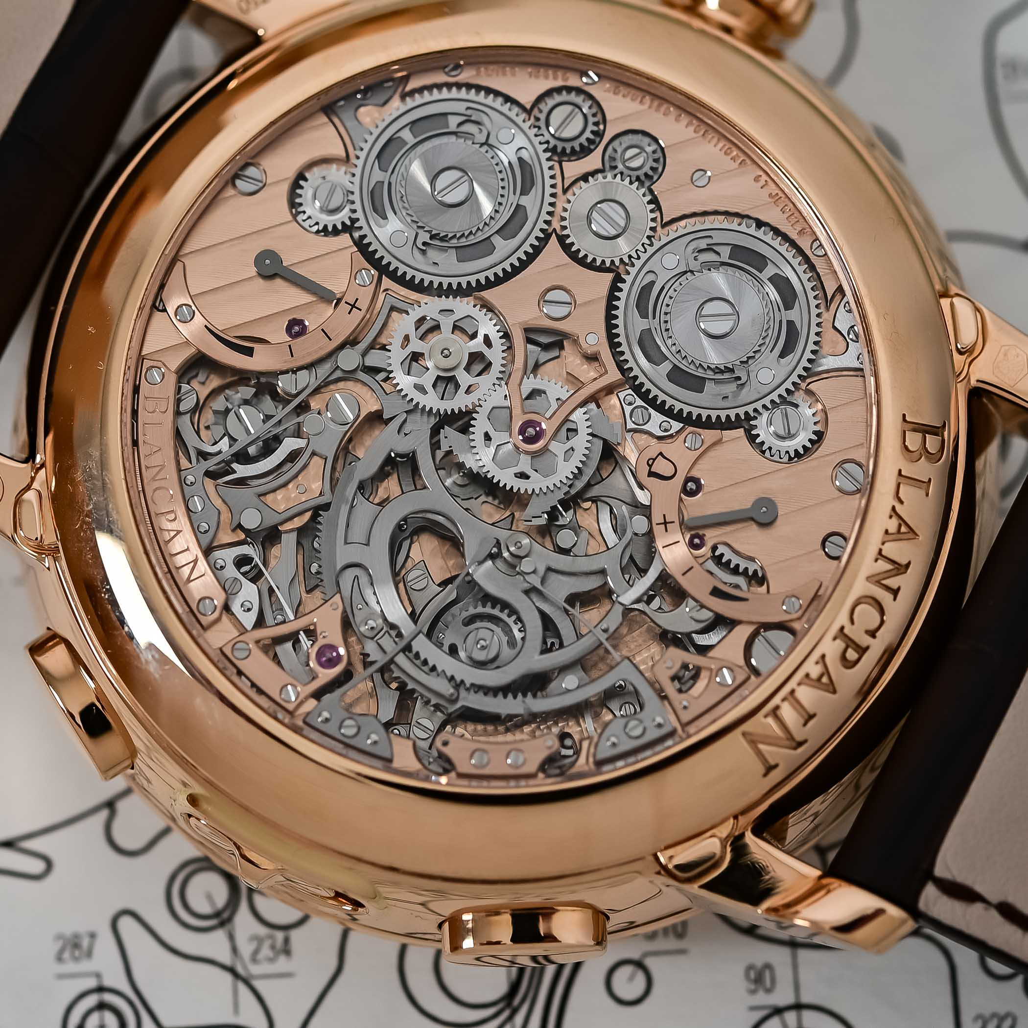 Чтобы дать вам представление о масштабе проекта, приведем несколько цифр. Разработка часов заняла 8 лет, в ходе которых на свет появились 1200 технических чертежей и 21 патент, поданный прямо в процессе разработки. Тринадцать патентов в итоге нашли применение в грандиозном механизме часов. Механизм, к слову, состоит не менее чем из 1053 компонентов, полностью разработанных, изготовленных, собранных и декорированных на мануфактуре Blancpain.