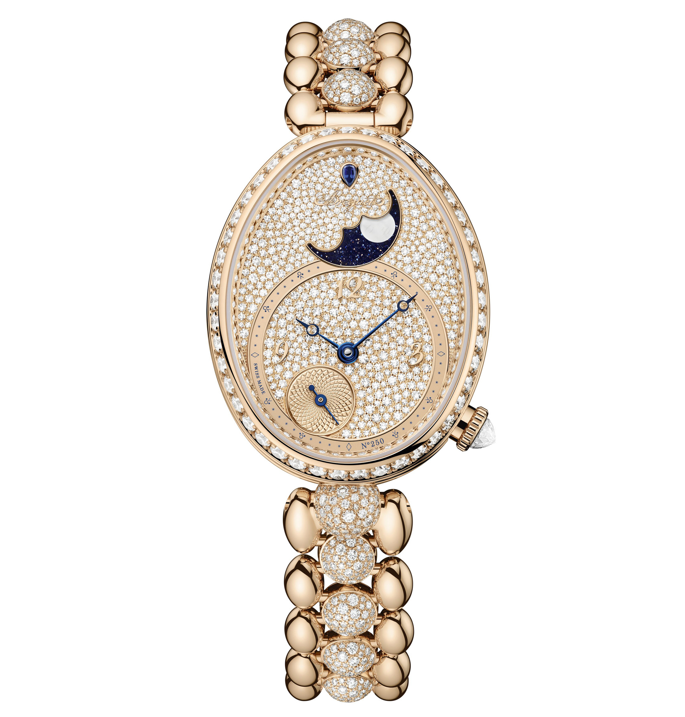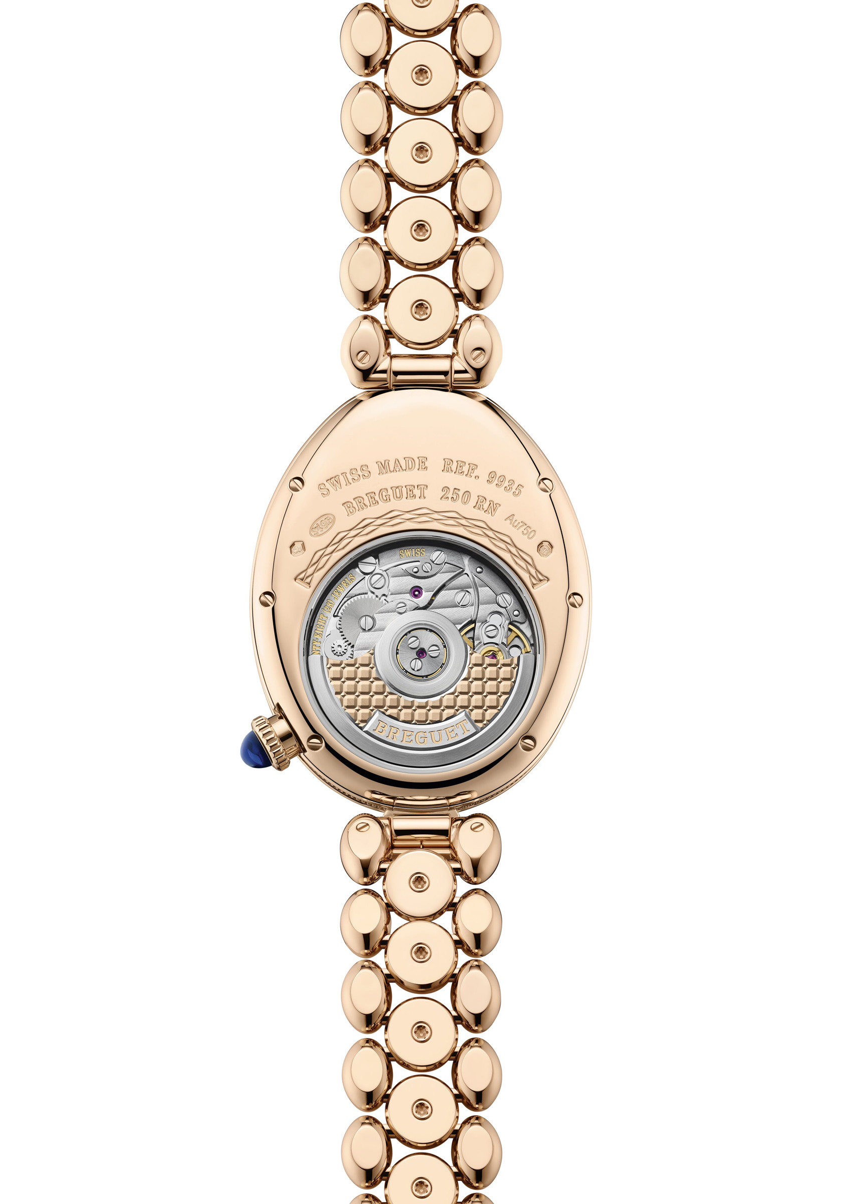Модель Reine de Naples 9935, выпущенная в 4 вариантах, представляет собой пример обновленной эстетики линейки Reine de Naples. Во-первых, можно заметить, что с циферблата часов убрали индикатор запаса хода, а индикатор лунных фаз стал значительно больше. Часовая шкала на малом циферблате новинки обозначена арабскими цифрами из золота (впервые в коллекции), которые чередуются с бриллиантами грушевидной формы.