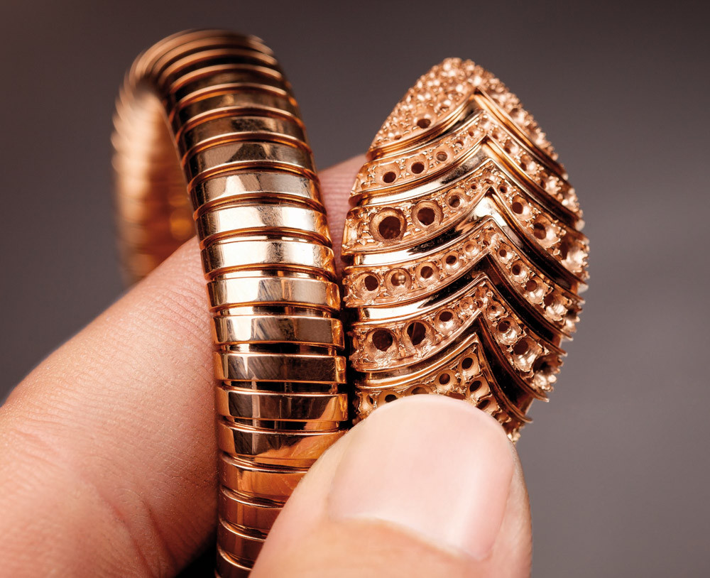 Интересно, что техника Tubogas была запатентована еще в XIX веке для транспортировки газов по газопроводам – отсюда и такое «индустриальное» название. Хотя мастера Bvlgari взяли эту технику на вооружение с первых дней существования коллекции Serpenti, им понадобилось целых 15 лет, чтобы адаптировать ее к производству часов и отточить до совершенства.
