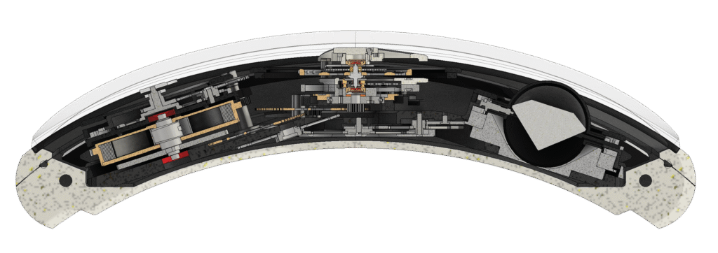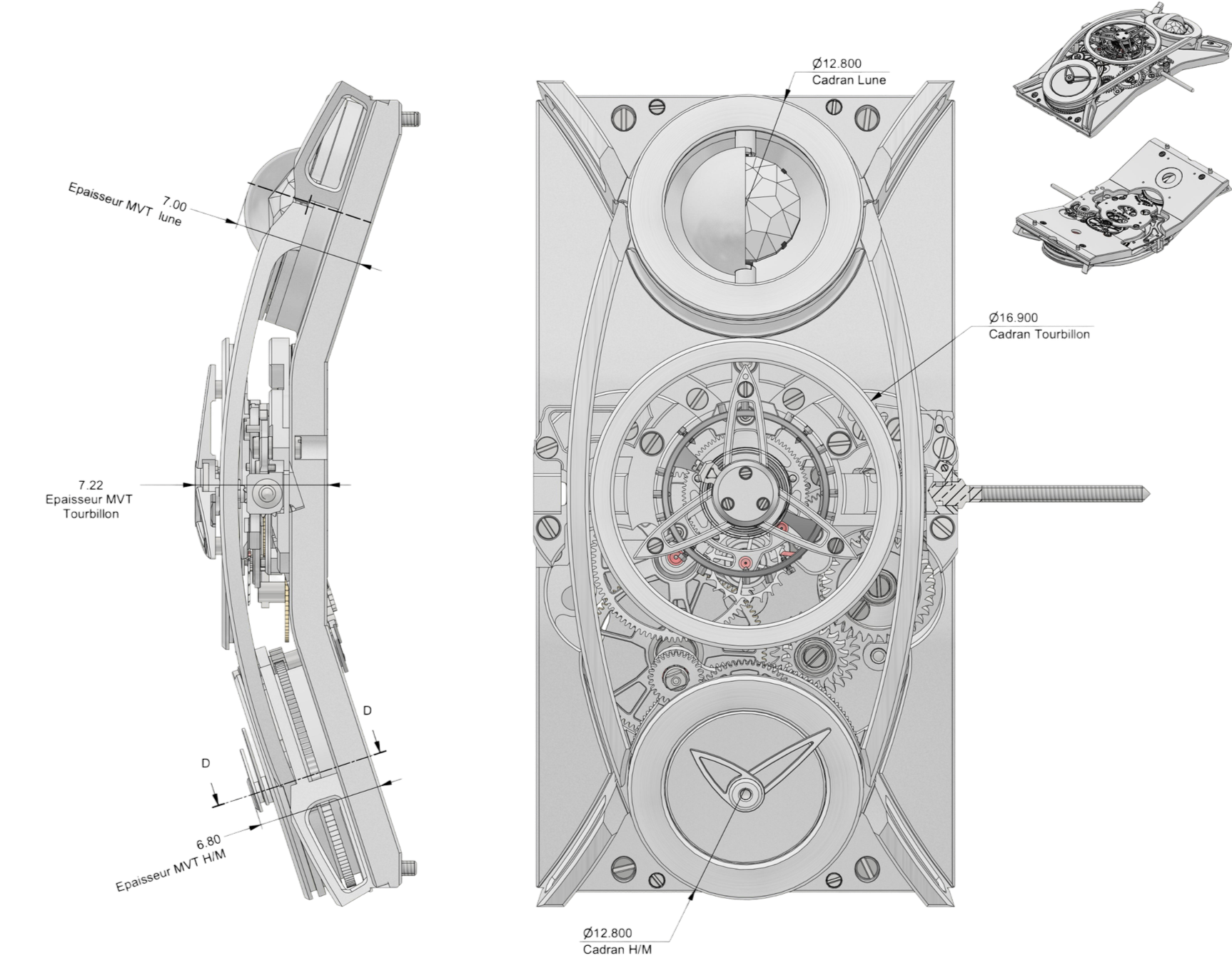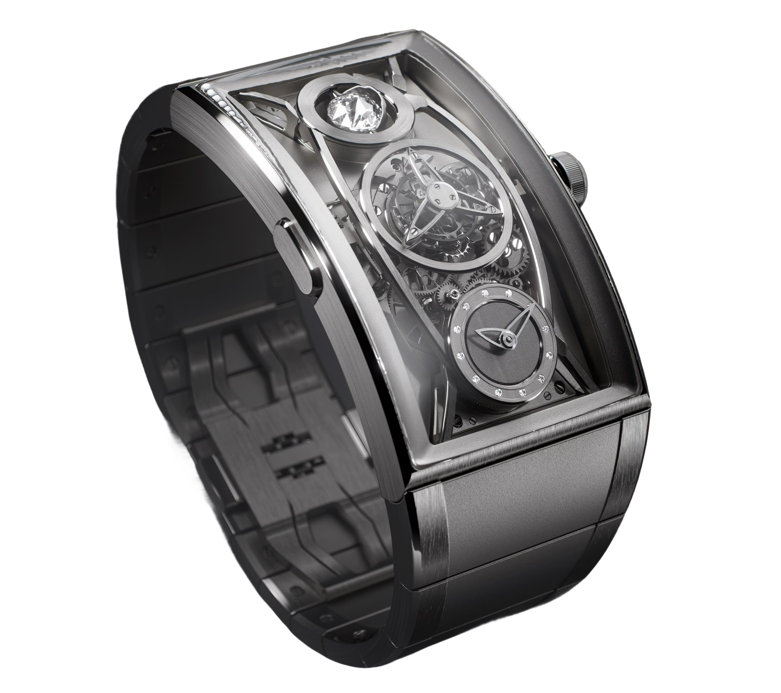 И сами часы, и установленный в них механизм с ручным подзаводом были разработаны группой специалистов. В нее вошли часовой конструктор из Artime и специалист по сложным механизмам Vanguart. Часы будут поставлять как на ремешке из кожи (CHF 120,000), так и на титановом браслете (CHF 150,000).