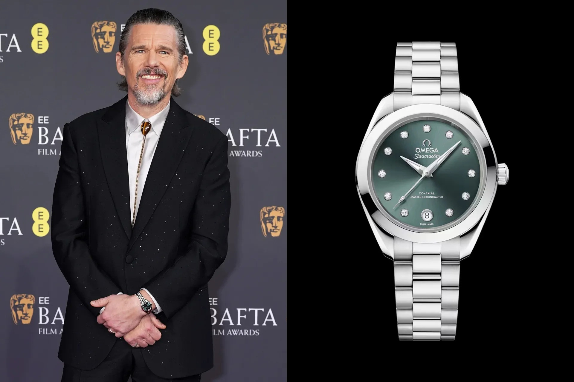 Итан Хоук выбрал для премии миниатюрные часы Omega Seamaster Aqua Terra с зеленым циферблатом. Насколько миниатюрные? Диаметр корпуса составляет 30 мм, так что часы очевидно женские. Впрочем, мы уже отмечали тренд на женские часы среди мужчин и, похоже, в этом году он сохранится.