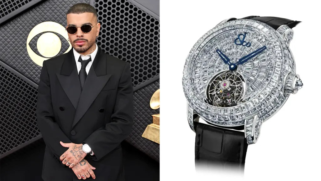 Модель с корпусом из желтого золота 2000 года выпуска Бэд Банни дополнил роскошным кольцом Panthère и соответствующими запонками.