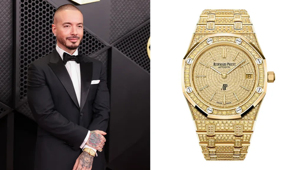 Черный смокинг Джея Балвина в этом образе дополняют необычные Audemars Piguet. Модель представлена в корпусе из желтого золота с 1528 желтыми сапфирами бриллиантовой огранки общим весом 10,41 карата.