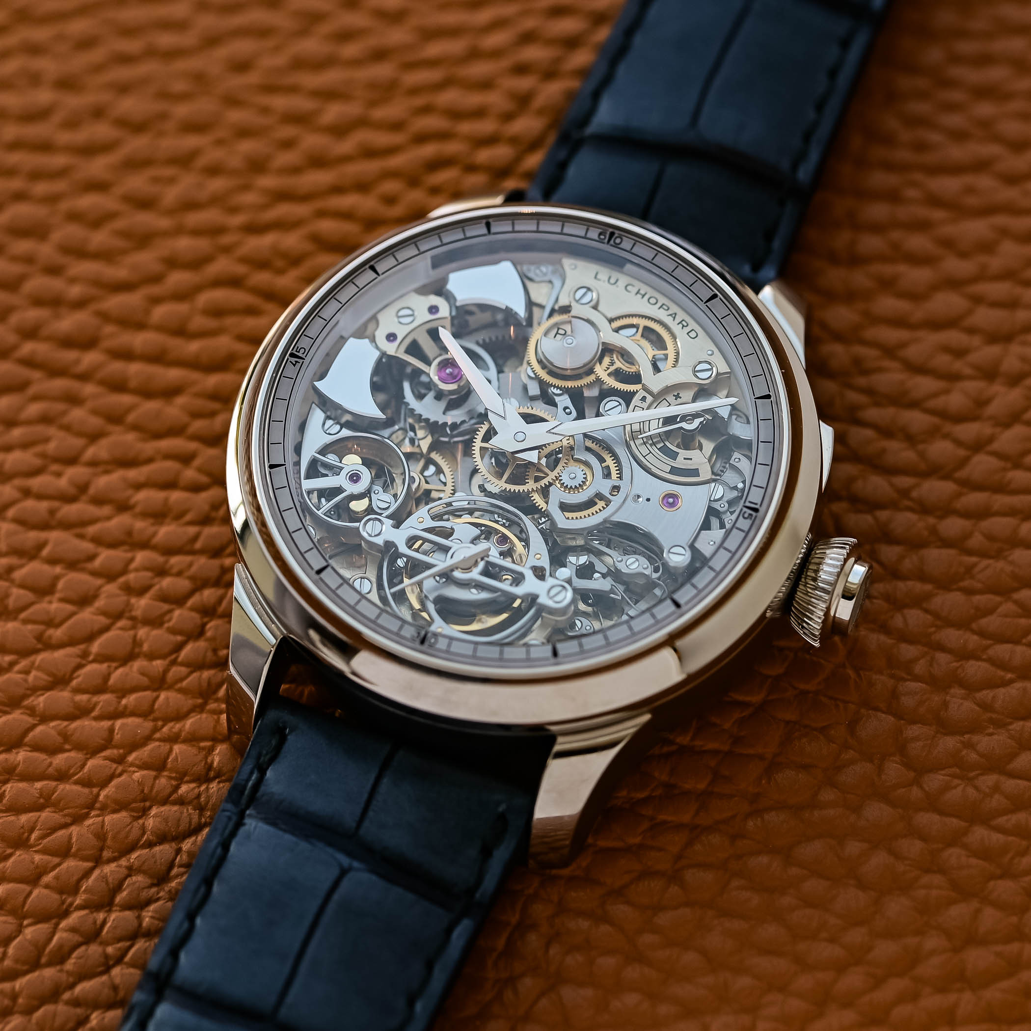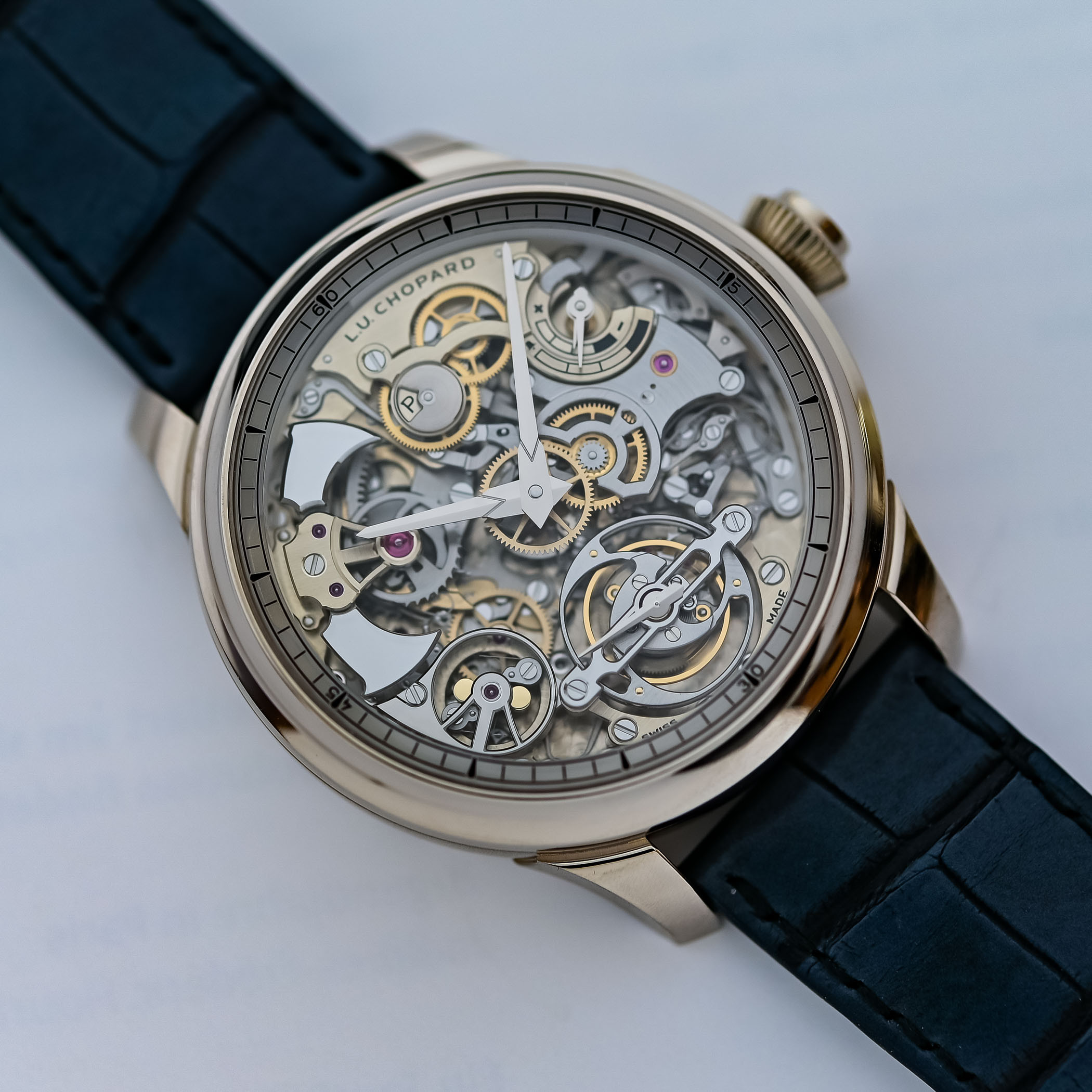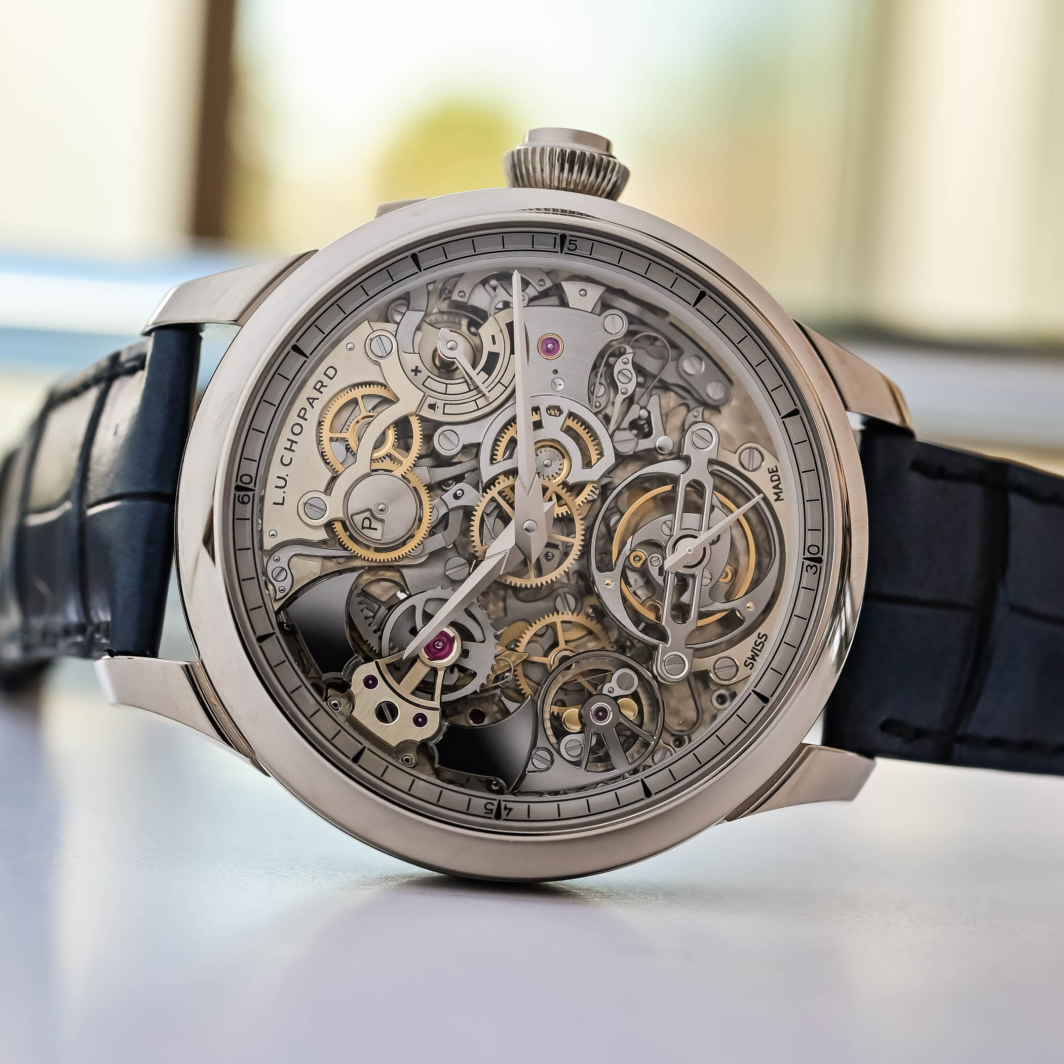 Перекочевали они и в новинку, которая изготовлена в формате скелетона. Циферблат модели открывает беспрепятственный обзор на механизм (калибр L.U.C 08.03-L), состоящий из 686 деталей. Отделка механизма, выполненная в соответствии со строгими стандартами Женевского клейма, включает зеркальную полировку, скошенные фаски и классический декор «женевскими волнами». Мосты и платина изготовлены из нейзильбера, а мост турбийона – из зеркально отполированной нержавеющей стали.