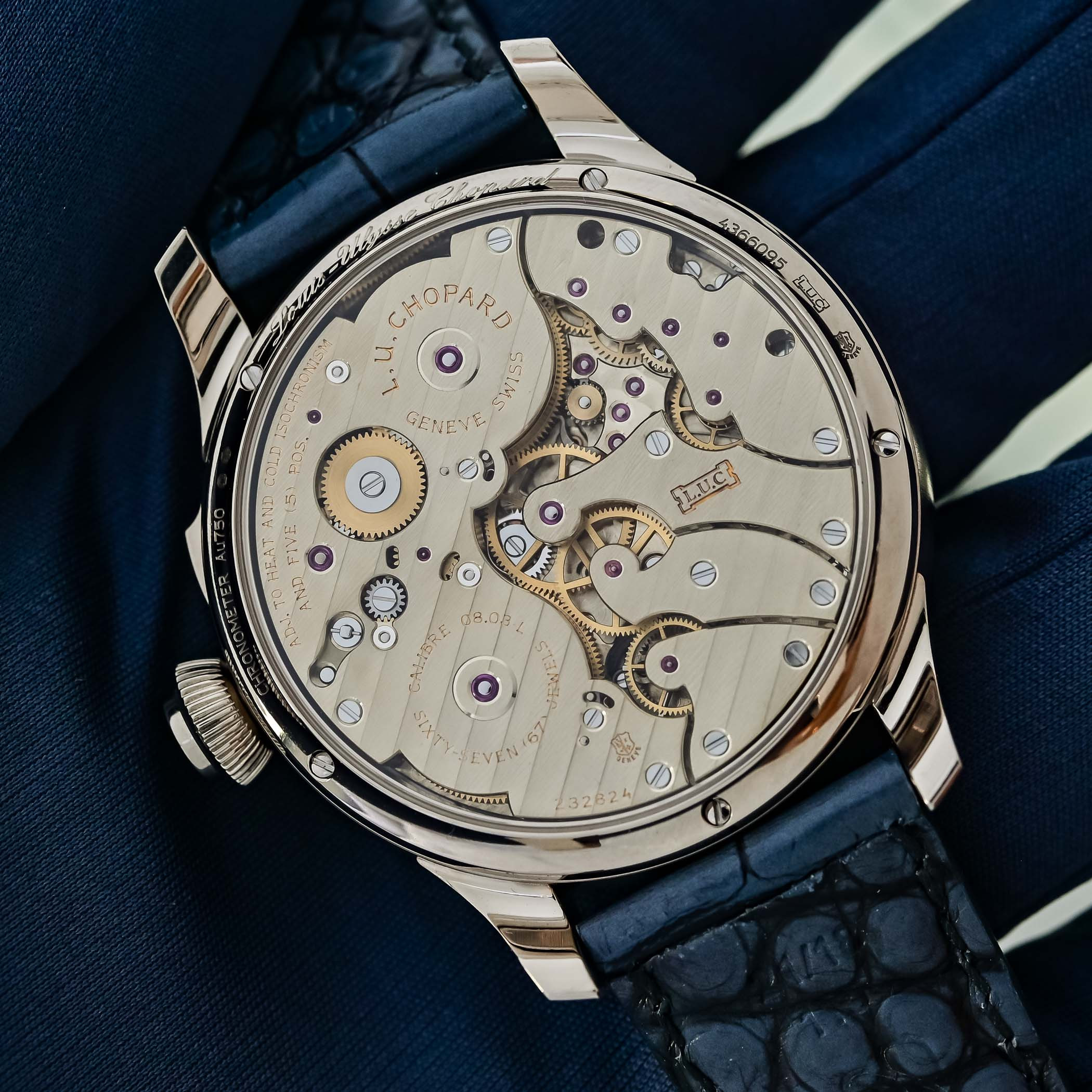 Часы представлены в 43-миллиметровом корпусе из белого золота. Дизайн корпуса воплощает принципы новой эстетики коллекции L.U.C, которую мы наблюдали в новинках начала 2025 года. Это изогнутый безель, приваренные ушки, рифленая заводная головка и удобная система замены ремешка. В прототипе модели, который представлен на фото, система замены ремешка не использована.