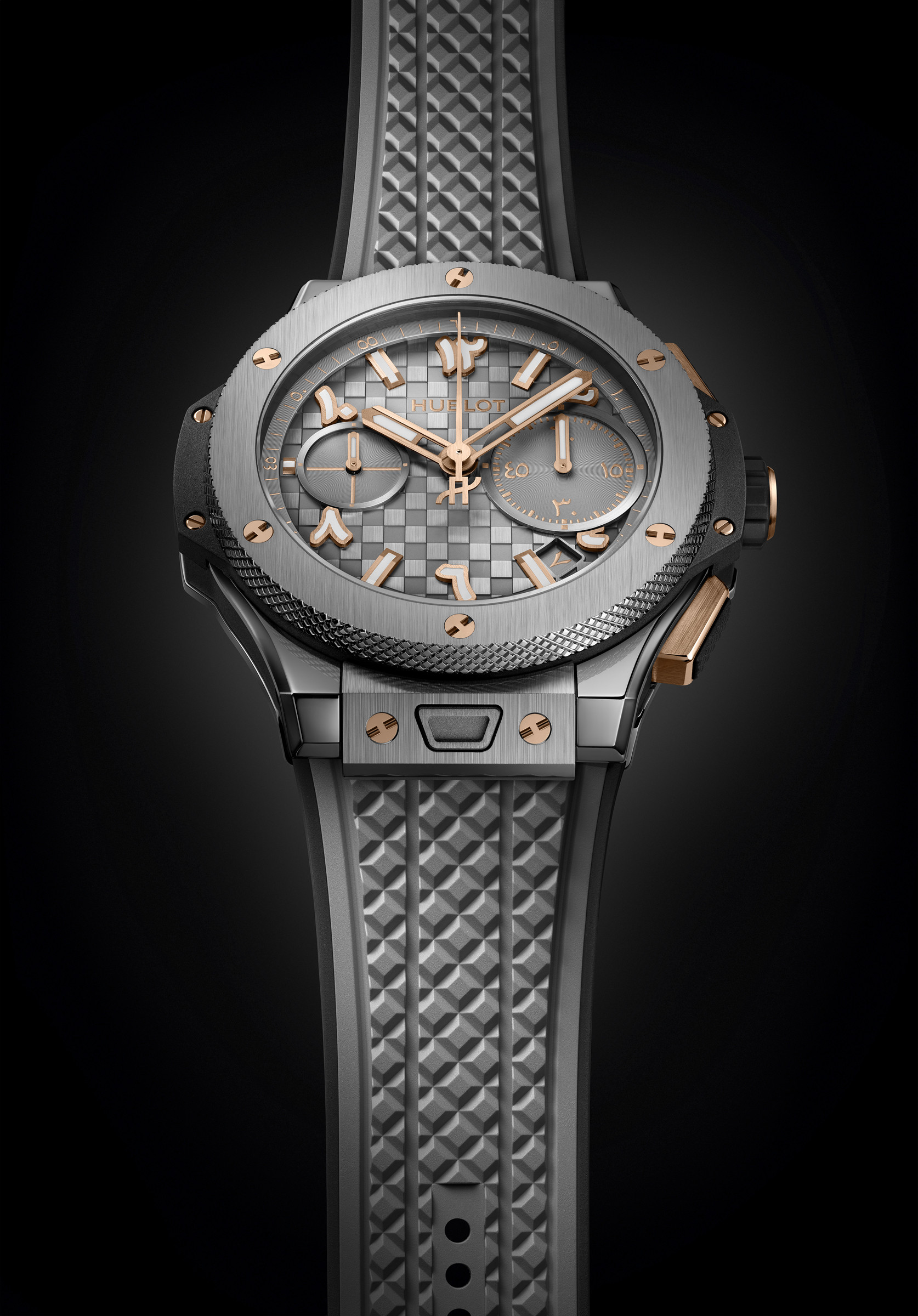 Лимитированная серией 25 экземпляров модель Hublot Big Bang Titanium Grey Ahmed Seddiqi 75th Anniversary получила титановый корпус с чередованием полировки и сатинирования в отделке. Заводная головка и кнопки хронографа выполнены из сплава King Gold и также оформлены каучуком.