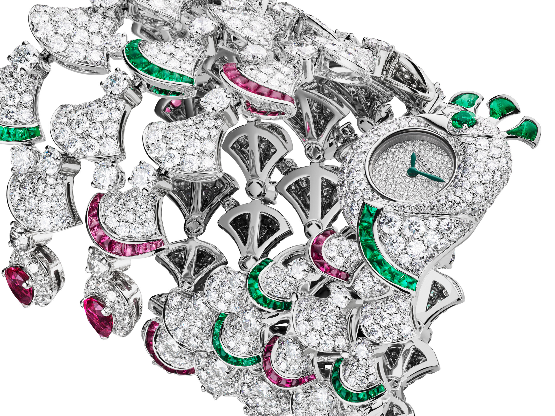 В начале недели в Милане компания Bvlgari представила новую коллекцию с говорящим названием Eclettica. Мы сделали обзор на 3 модели из этой коллекции. Одна из них напоминает роскошного павлина, который словно присел на запястье отдохнуть. Часы изготовлены из белого золота. Мягко обвивающий руку браслет модели стилизован под хвост павлина с изящными веерообразными перьями.
