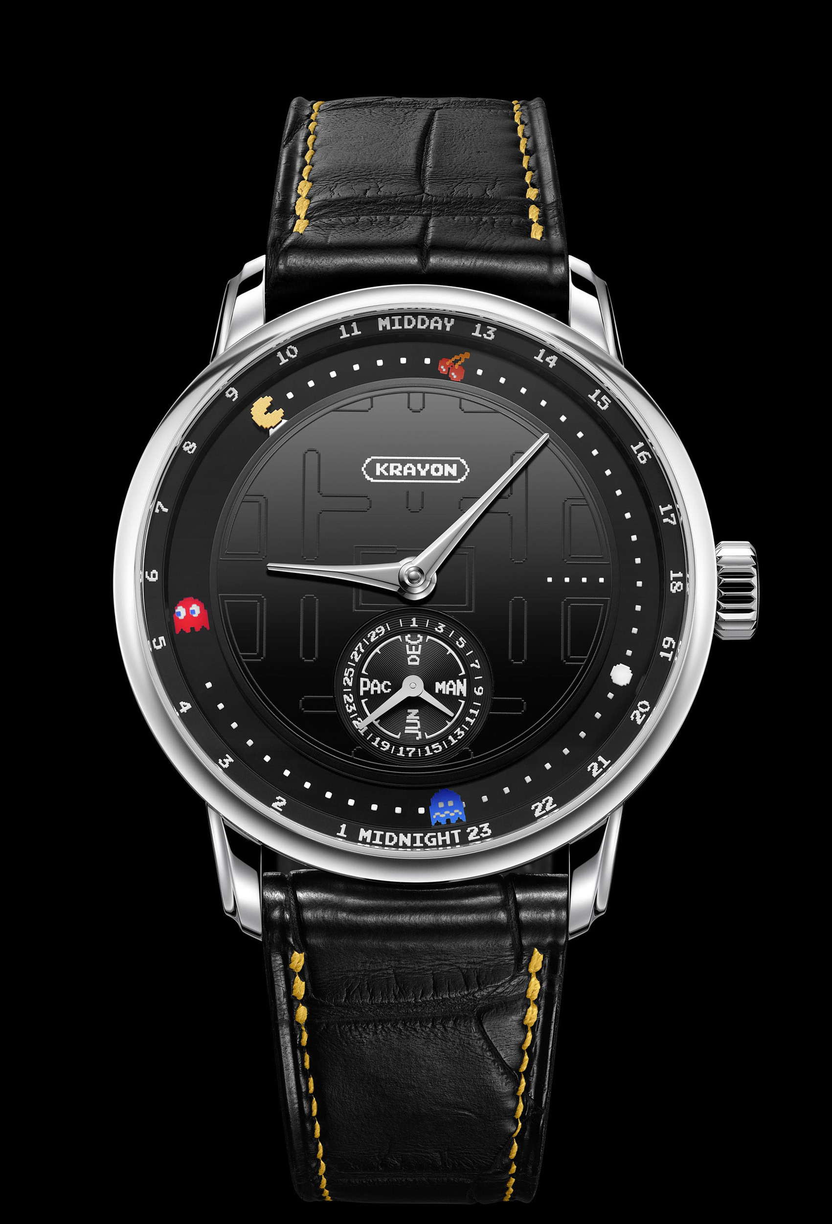 Эта новинка – переосмысление модели Krayon Anywhere через стилистику игрового концепта PAC-MAN. Часы представлены в корпусе из платины 39 х 9,5 мм. Основание циферблата выполнено из полированного оникса. Лабиринт PAC-MAN изображен на нем методом полупрозрачной тампографии, а значит, виден только при попадании света под определенным углом. Вокруг него как будто нарисованные вручную фрукты и призраки.