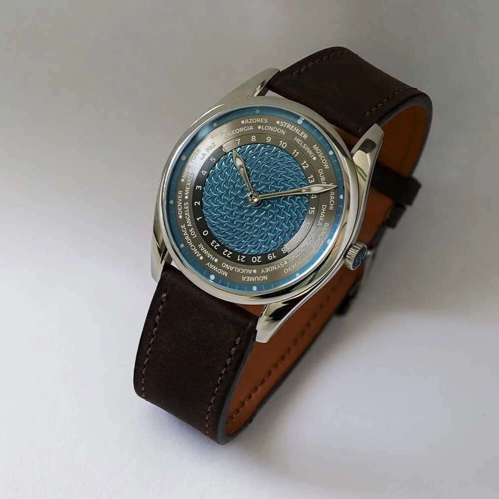 Интуитивно понятный волдтаймер от Андреаса Штрелера. Часы заключены в стальной корпус 40 х 9,7 мм. Всеми функциями модели управляет трехпозиционная заводная головка. Циферблат выполнен из отполированного вручную титана. Дизайн циферблата включает обязательные для волдтаймеров элементы – кольцо с названиями городов и двухцветную 24-часовую шкалу, обработанные люминофором. Символ солнца возле некоторых городов означает, что в соответствующих часовых поясах переходят на летнее время.