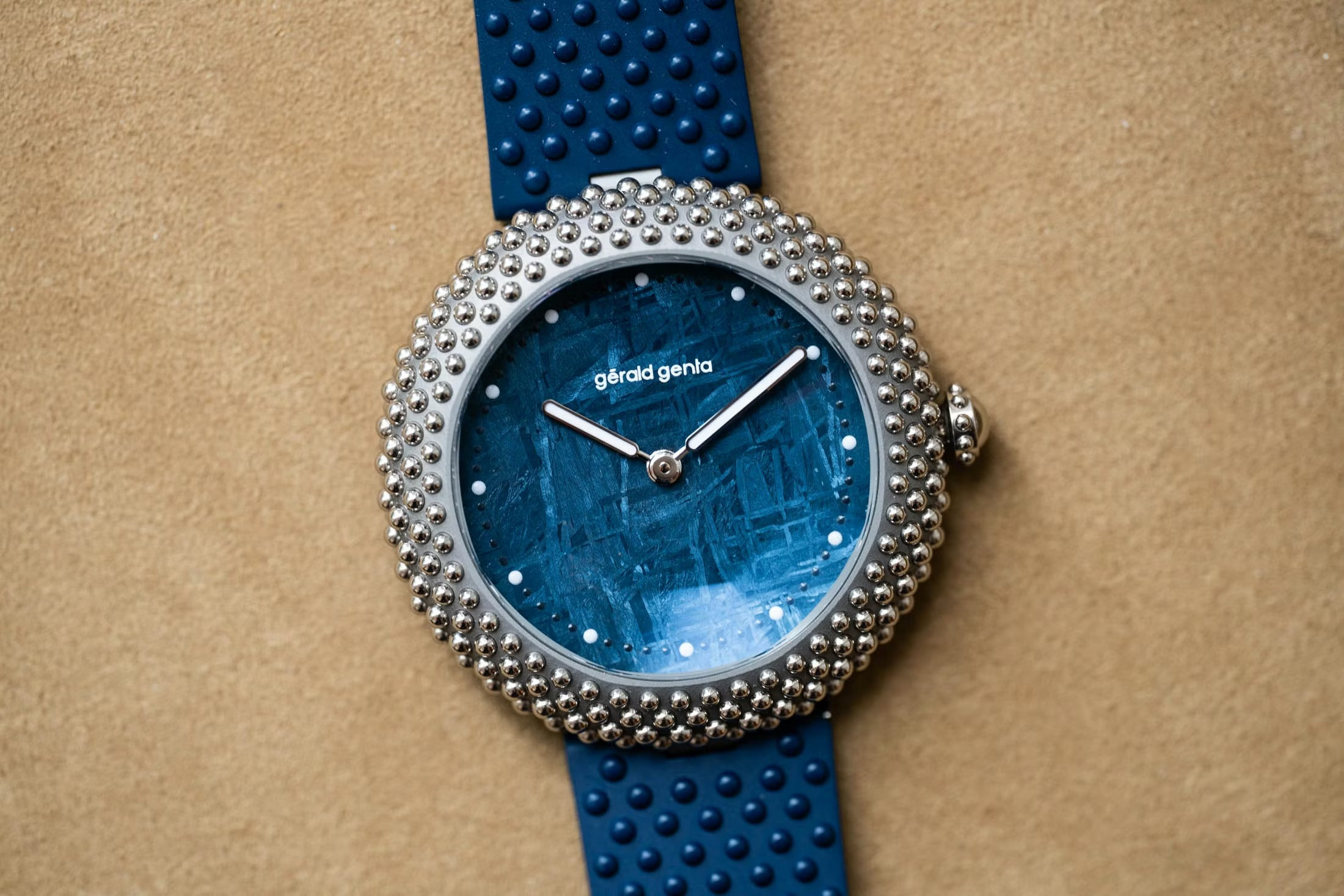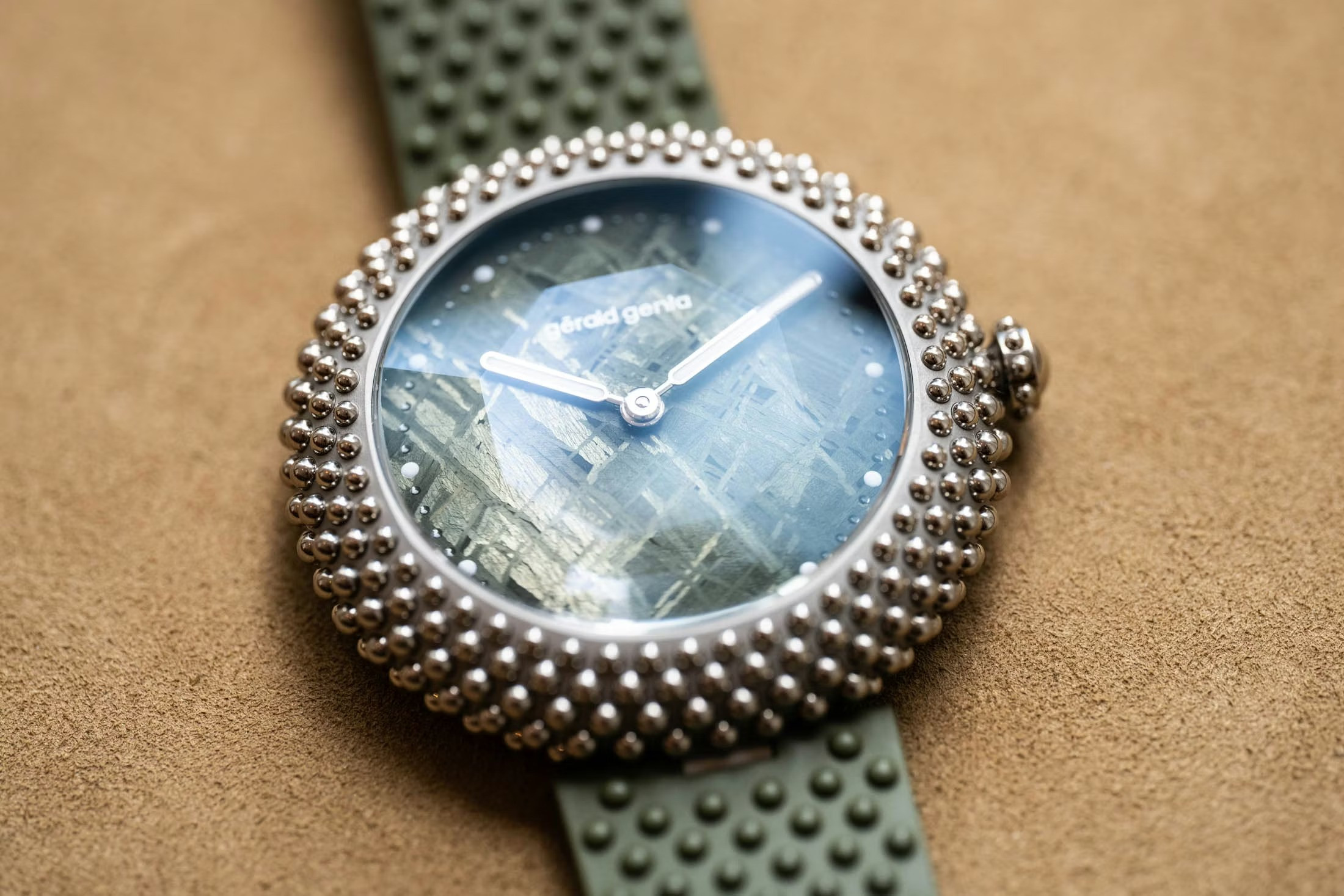 В рамках Dubai Watch Week 2025 возрожденный 2 года назад бренд Gérald Genta представил две новинки Gentissima Oursin. По сравнению с предыдущими моделями из этой серии часы стали крупнее и обзавелись циферблатами из метеорита.