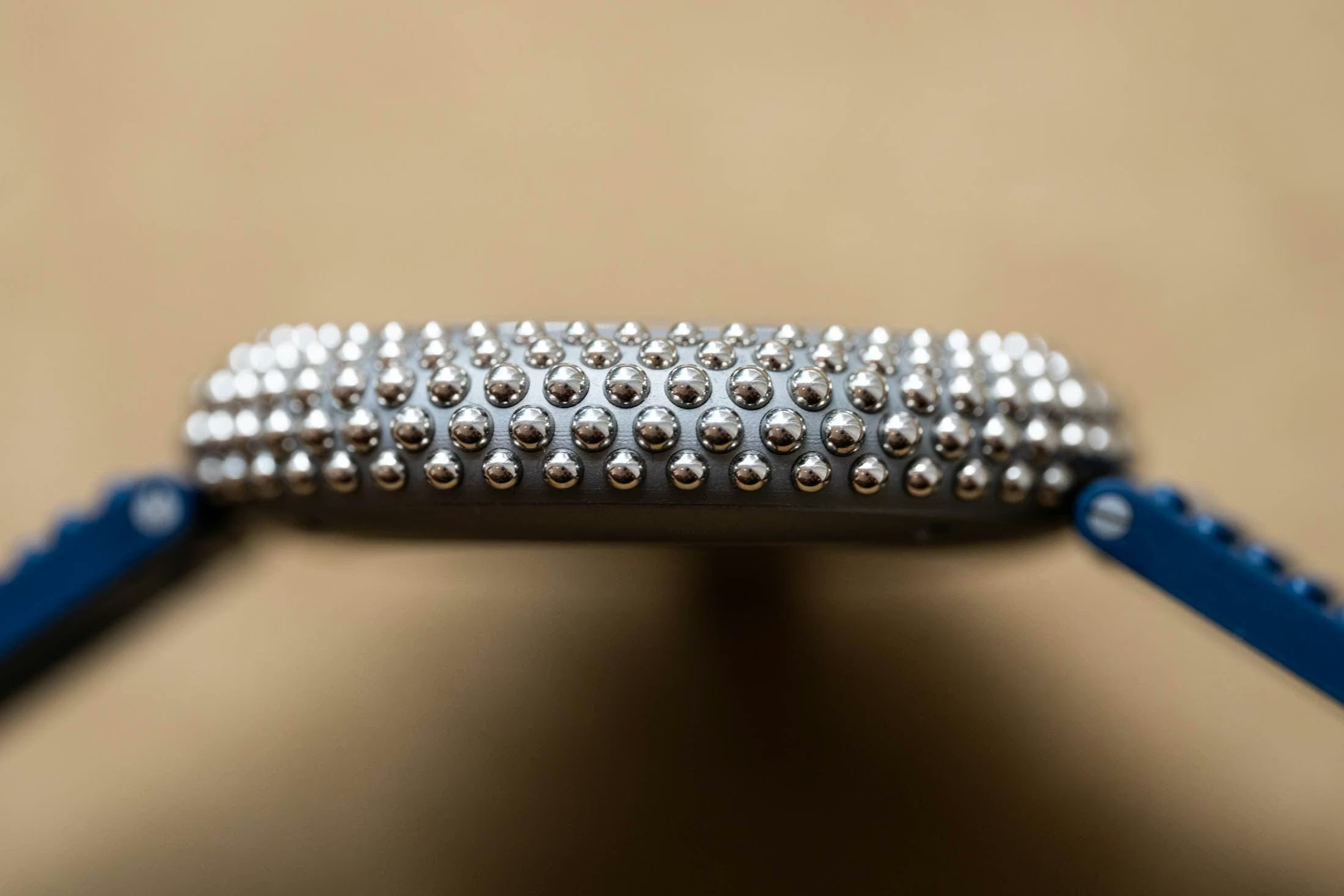 Часы поставляются с каучуковым ремешком в тон циферблату, поверхность которого украшена все теми же бусинами-шипами. Он обеспечивает комфортную посадку на запястье и долговечность в повседневной носке.