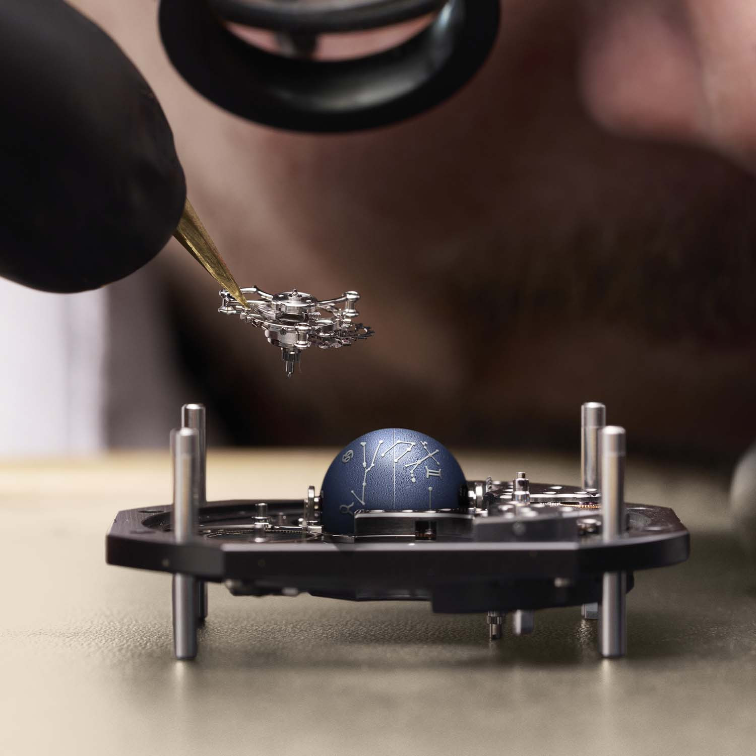 Глобусы изготовлены из титана, для придания текстуры обработаны лазером, а для читаемости в темноте покрыты люминесцентным составом синего свечения. Время считывается на малом циферблате, который расположен у отметки «12 часов». Он оснащен накладными часовыми метками из белого золота и комплектом стрелок Dauphine, обработанных синим люминесцентным покрытием Super-LumiNova.