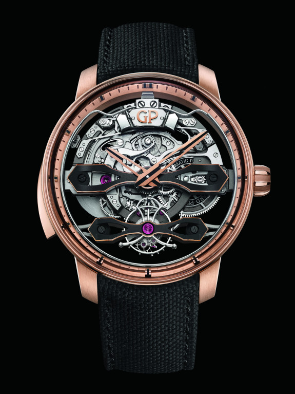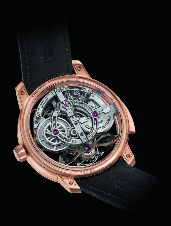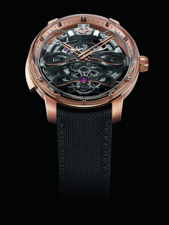 Компания Girard-Perregaux представила новинку, которая сочетает в себе минутный репетир, турбийон и механизм с автоподзаводом. Букет усложнений дополняют изящные стреловидные мосты, давно ставшие фирменной фишкой бренда.