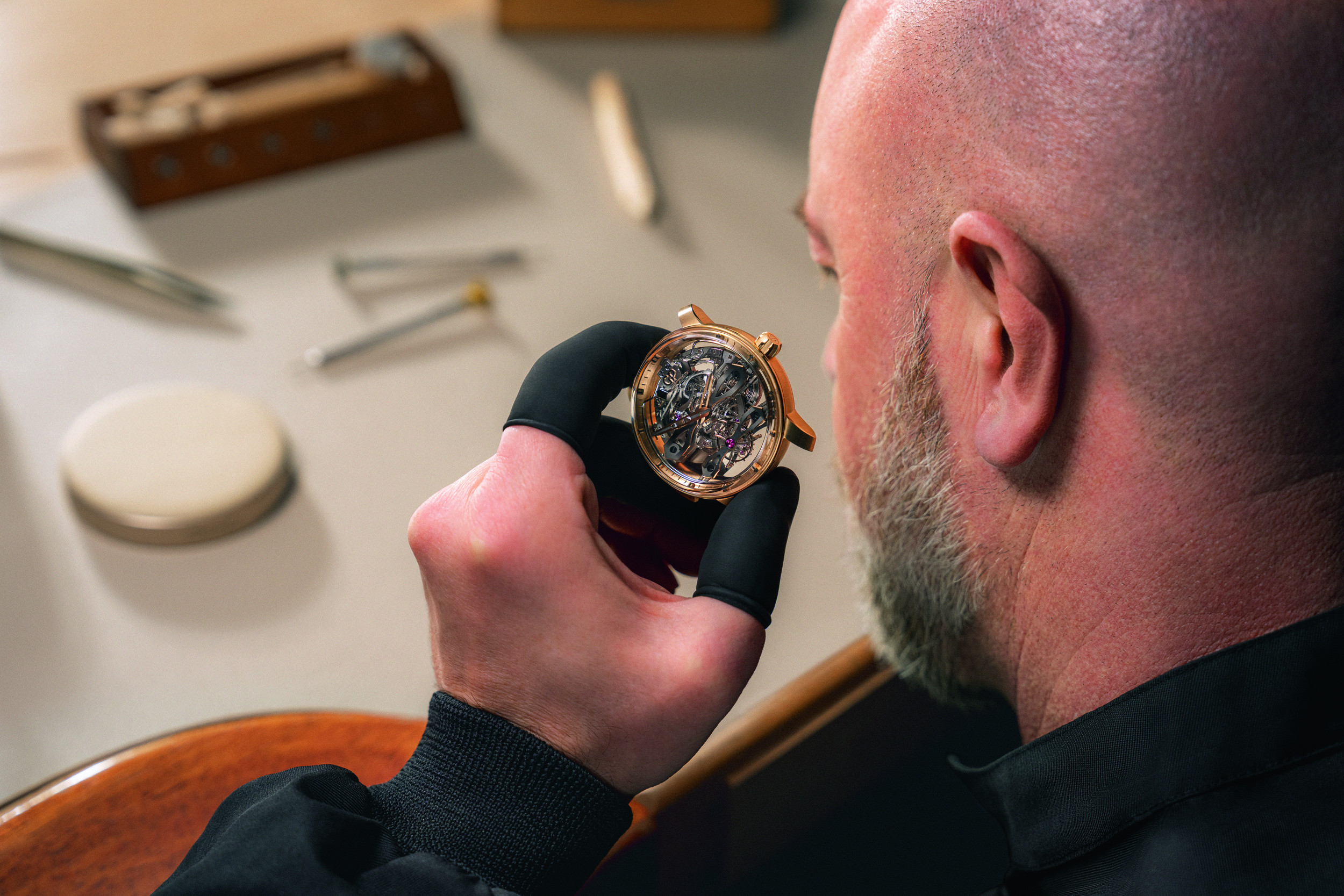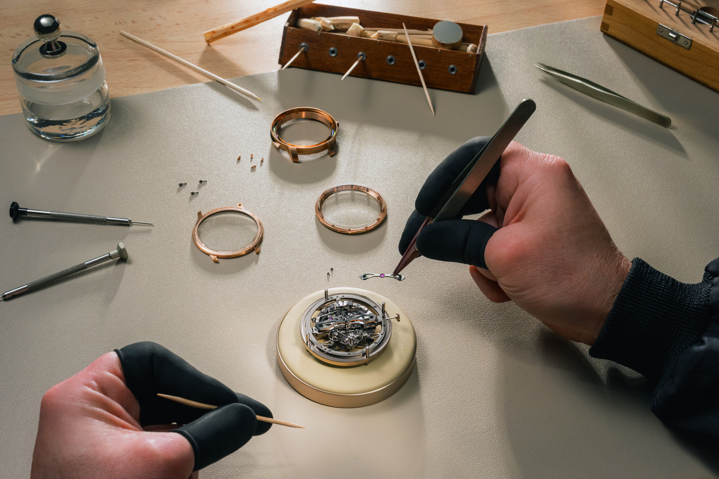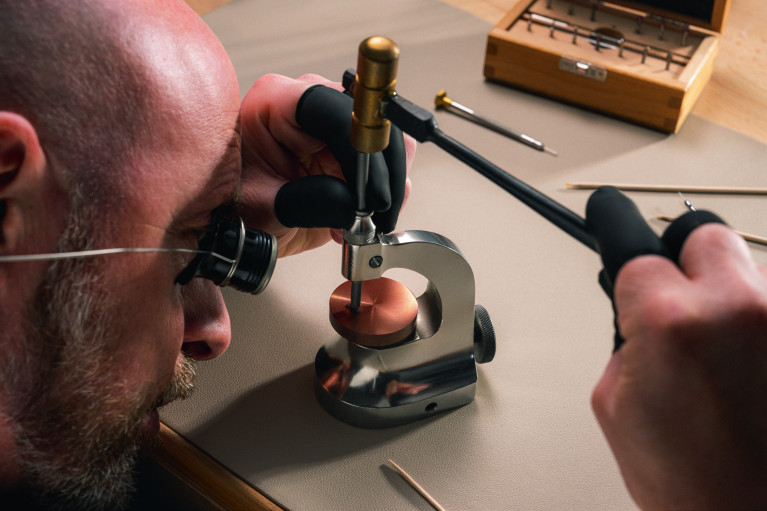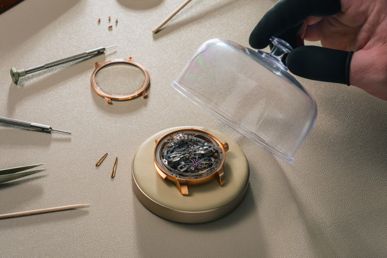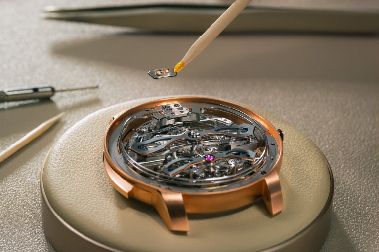 Поскольку механизм открыт для обзора, особое внимание в часах уделили отделке. В общей сложности на сборку и отделку механизма уходит более 440 часов, 240 из которых занимает финишная обработка. Приятный штрих в отделке – гравировка с инициалами часовщика, собравшего механизм. Искать ее предлагают под мостом, на котором указано количество камней и надпись «Swiss made».