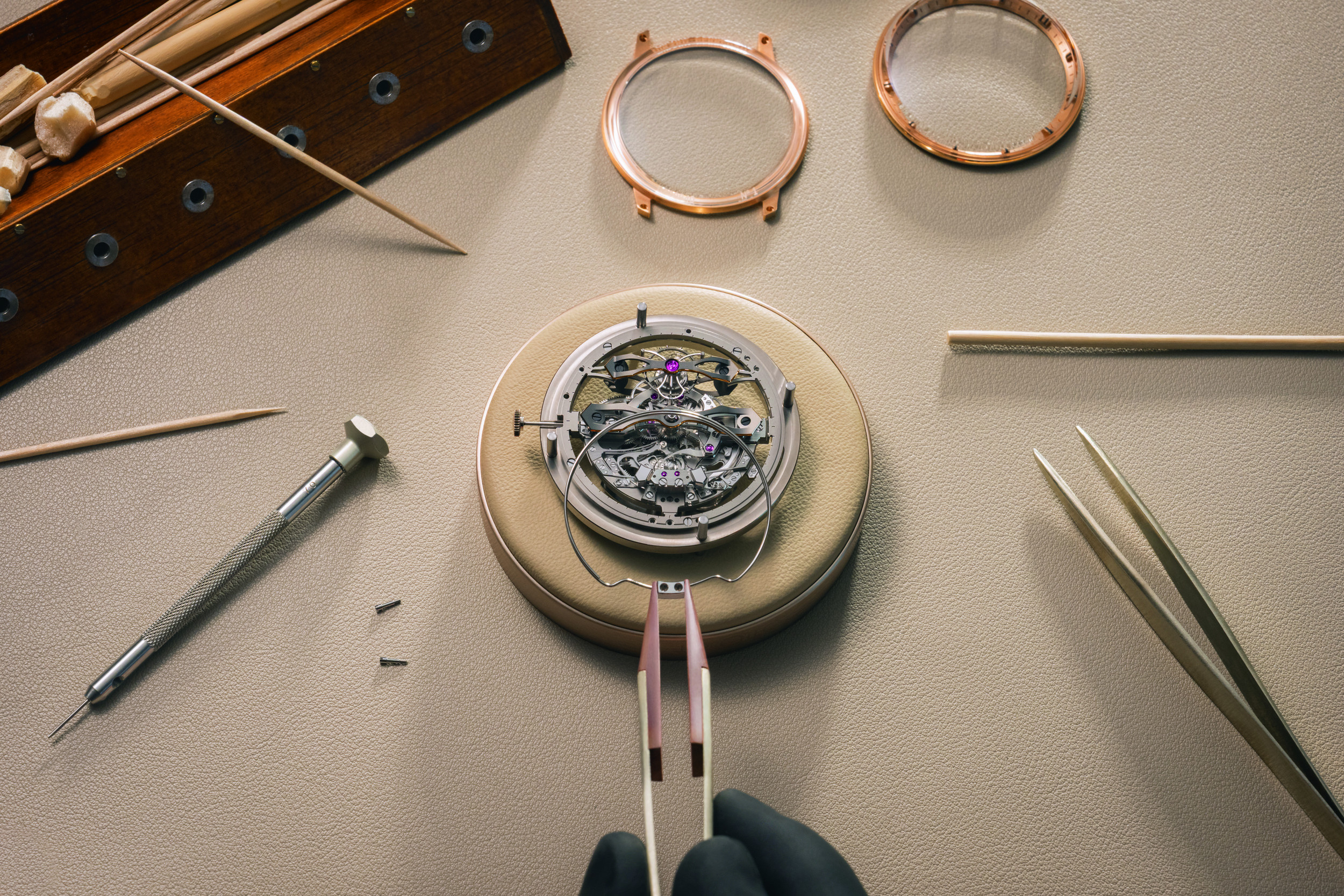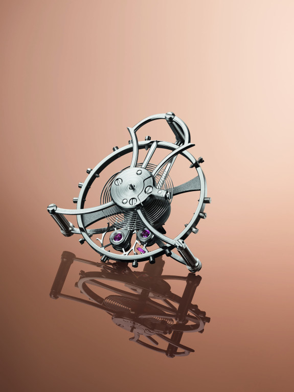 В композиции открытого циферблата доминируют два горизонтальных моста из розового золота – третий такой мост вынесли на обратную сторону часов. У отметки «6 часов» традиционно расположен турбийон, заключенный в фирменную лирообразную каретку. Здесь турбийон также выполняет функцию секундного счетчика, так как на каретке закреплена почти не заметная секундная стрелка.