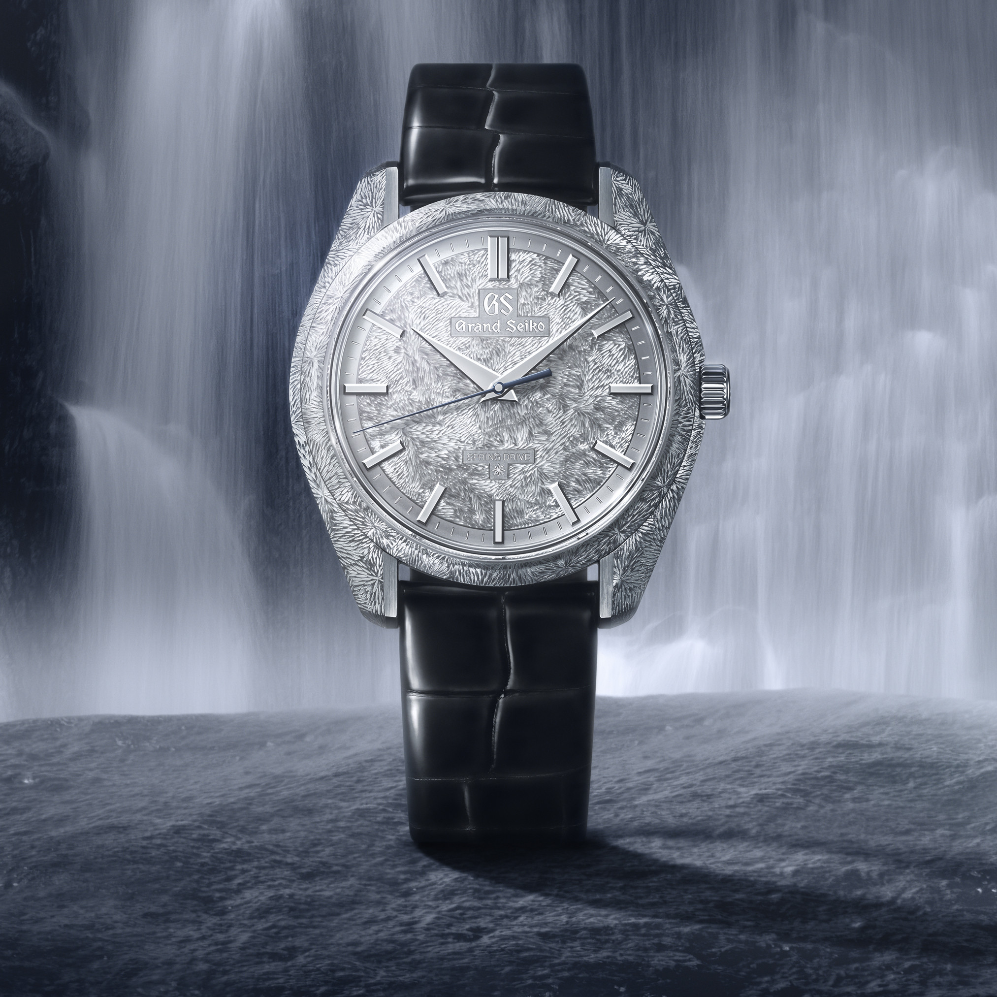 Новинка с корпусом ручной работы. Корпус 40 х 9,6 мм изготовлен из платины 950-й пробы. И циферблат, и корпус украшены ручной гравировкой с изображением узора, который вдохновлен водопадом Татесина Отаки. Узор выполнен таким образом, что создает ощущение движения.