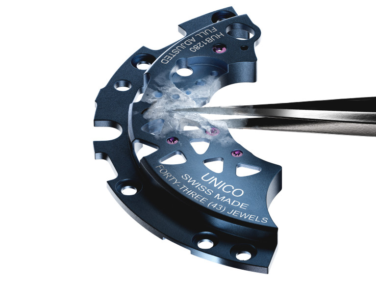 В основе часов лежит механизм UNICO HUB1280: мануфактурный калибр с автоподзаводом и 3-дневным запасом хода, защищенный 5 патентами. Он оснащен инерционным сектором в виде двух горизонтально расположенных муфт, противоударной системой, функцией блокировки храпового колеса с нулевым коэффициентом трения, фрикционом минутного колеса. Изюминка механизма – ротор в форме снежинки.