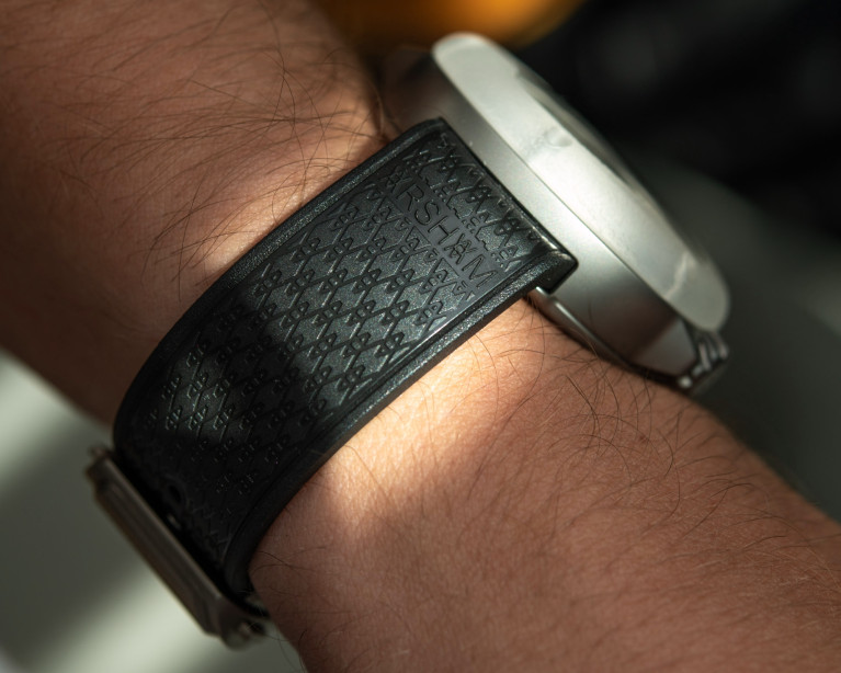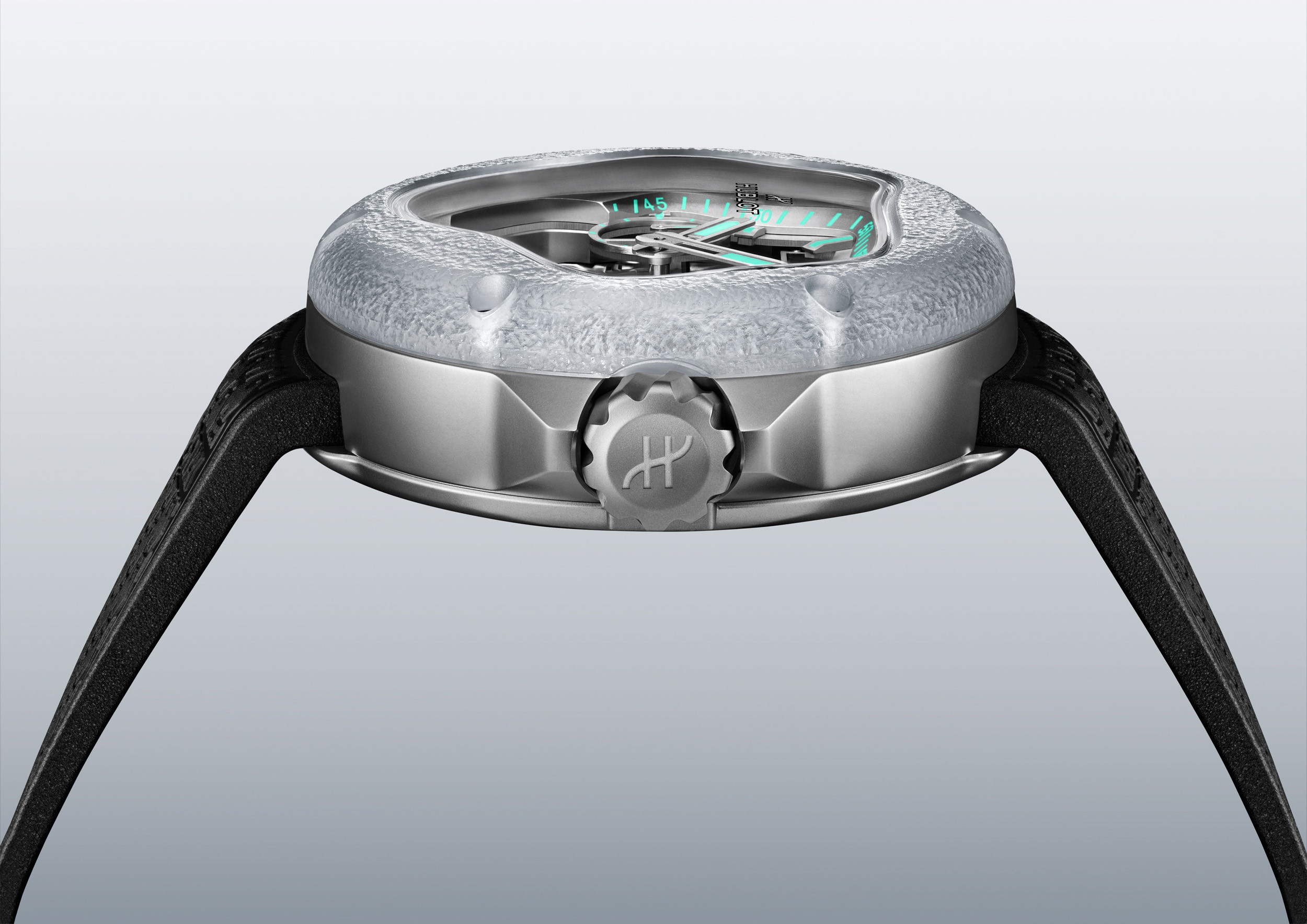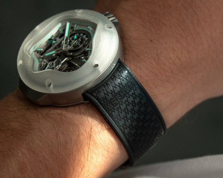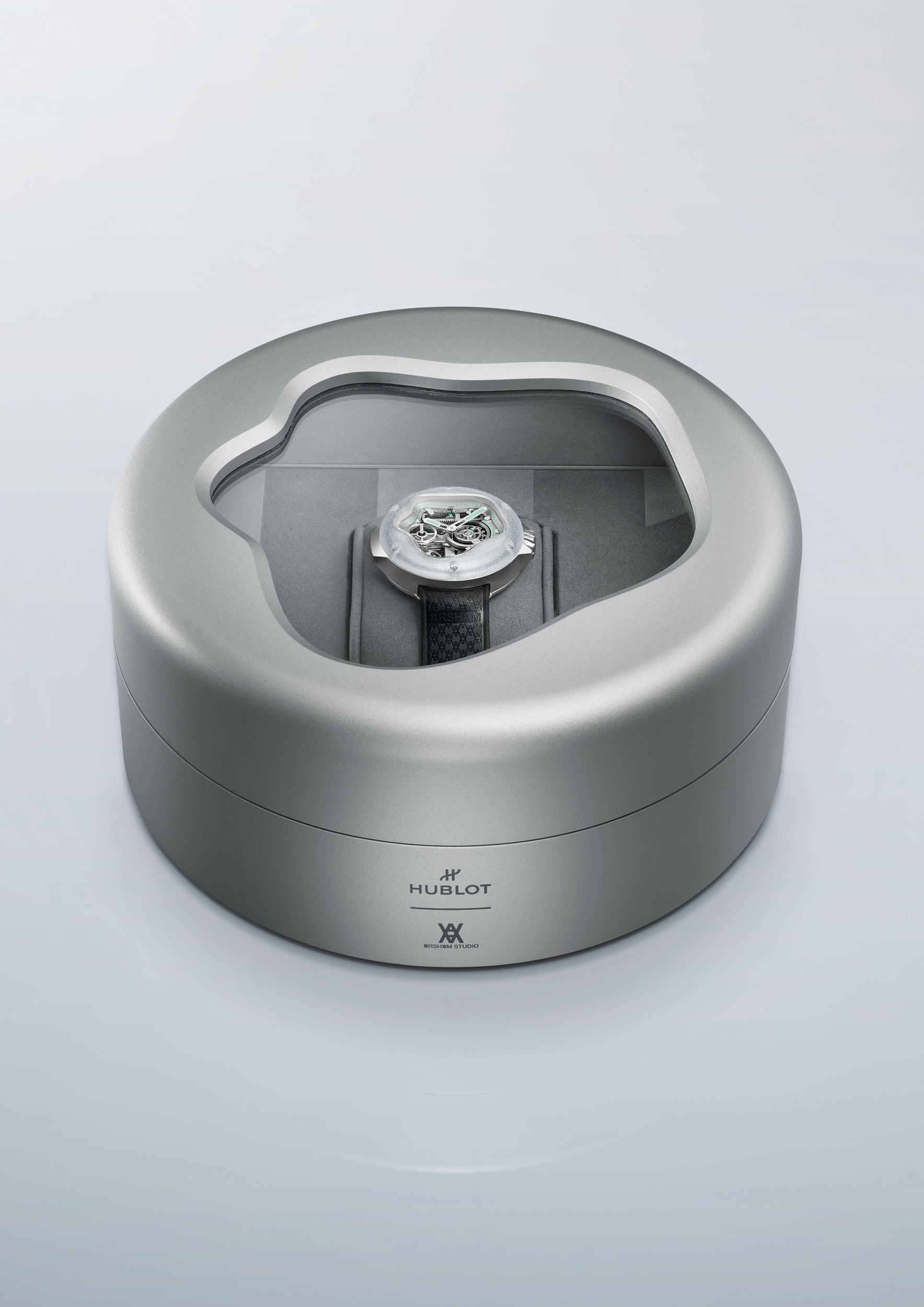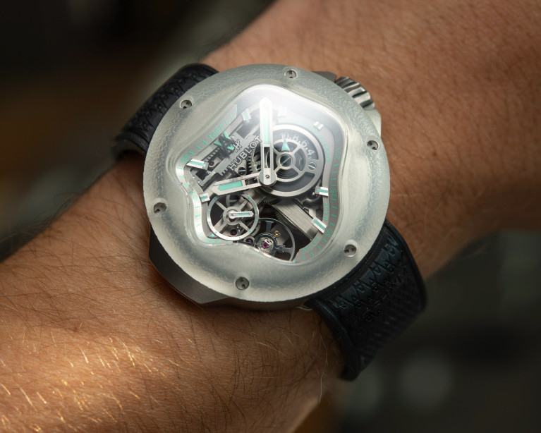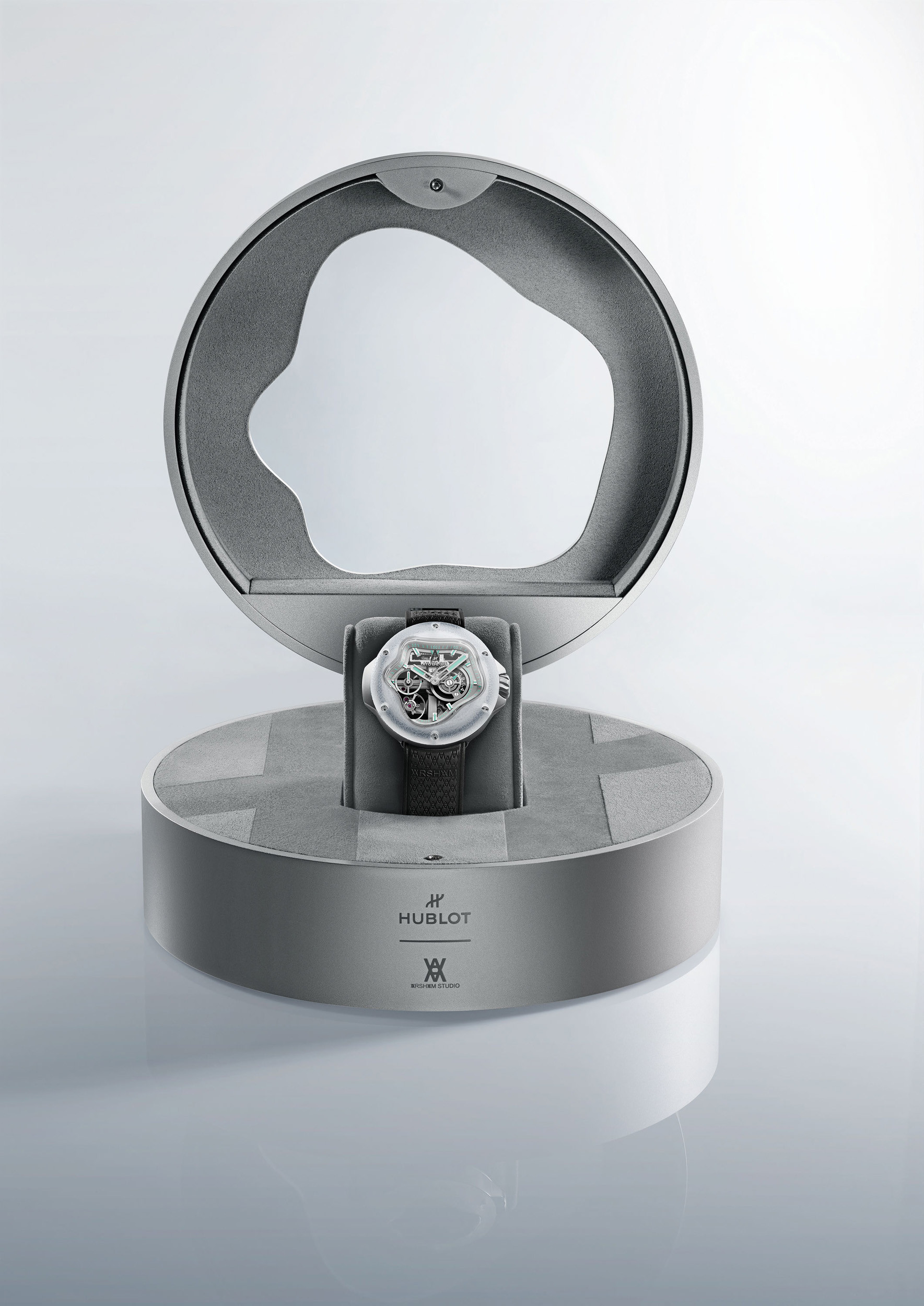 Сочетание материалов (сапфир, титан и каучук) отражает философию Hublot «Art of Fusion». Они же идеально вписываются в концепцию Дэниэла Аршама. Свою работу он называет «коллапсом времени» и делает ставку на то, что, глядя на созданный им предмет, невозможно точно сказать, из прошлого он или из будущего.
