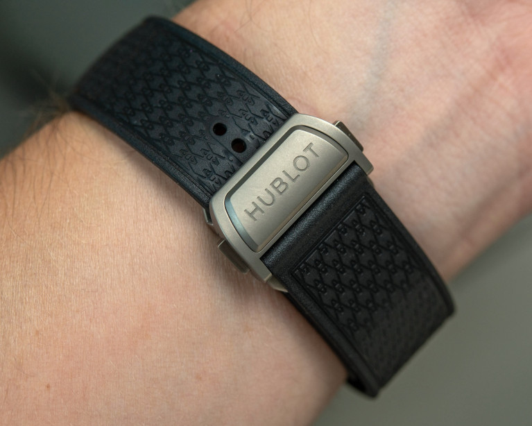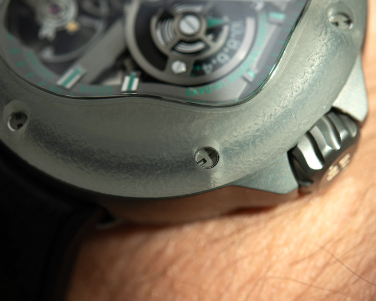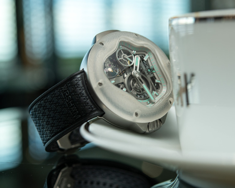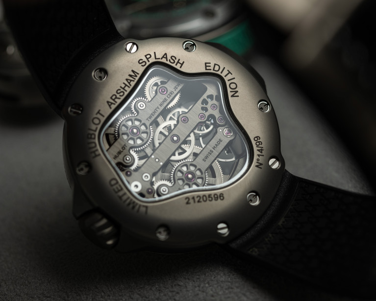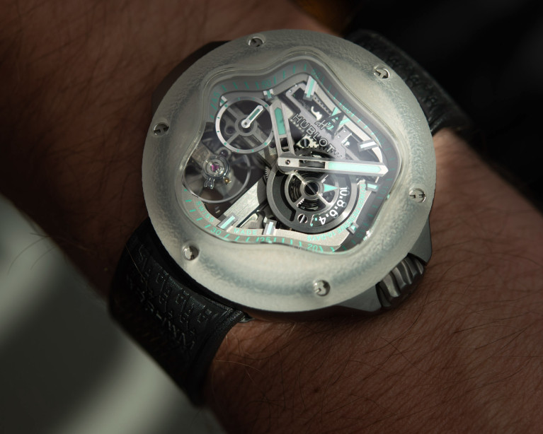 Все элементы фирменного стиля Hublot здесь на месте, включая Н-образные винты на безеле, характерные ушки с боков и Н-образную титановую застежку. При этом акцент в дизайне сделан на любимый Аршамом мятно-зеленый цвет.