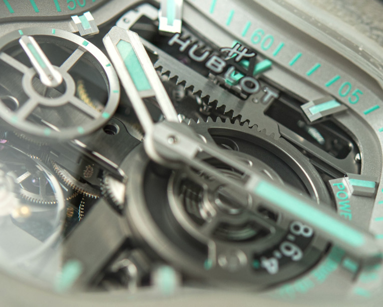 Работу часов обеспечивает калибр HUB1205. Механизм 33,5 х 6,8 мм является уменьшенной версией механизма MECA-10, но, несмотря на более компактный формат, сохраняет впечатляющий запас хода 10 дней.