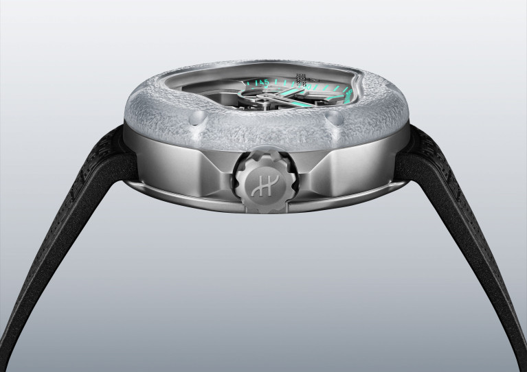 Корпус у новинки вполне стандартный. Шайба размером 42 х 15,35 мм выполнена из титана с микроструйной обработкой. Безель же изготовлен из отполированного, а затем текстурированного лазером сапфирового стекла. И именно он усиливает эффект «текучести» циферблата (отсылка к текучести воды и ее способности принимать любую форму).