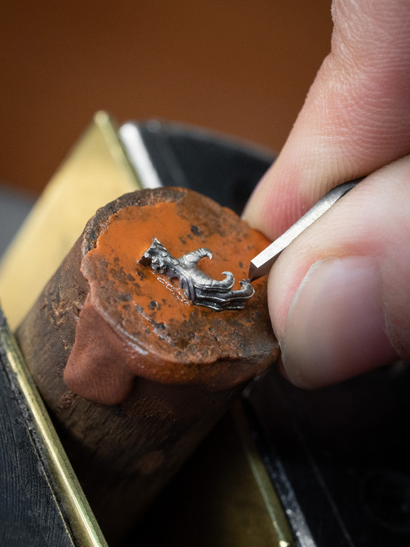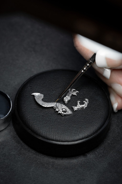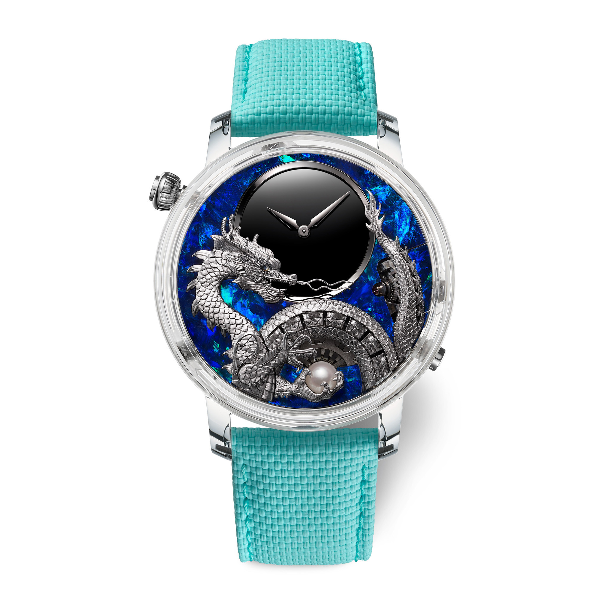 Заказчиком этих часов выступил некий коллекционер из Азии, который активно участвовал в процессе создания модели. Центром композиции на циферблате является накладной элемент в виде дракона, фигурка которого выполнена из белого золота. Это и есть автоматон, включающий 16 подвижных элементов.