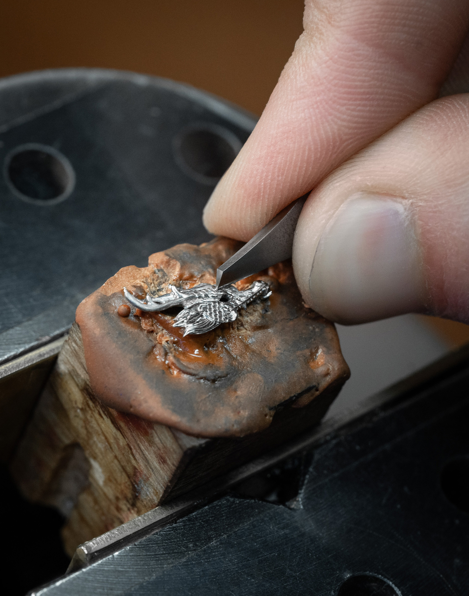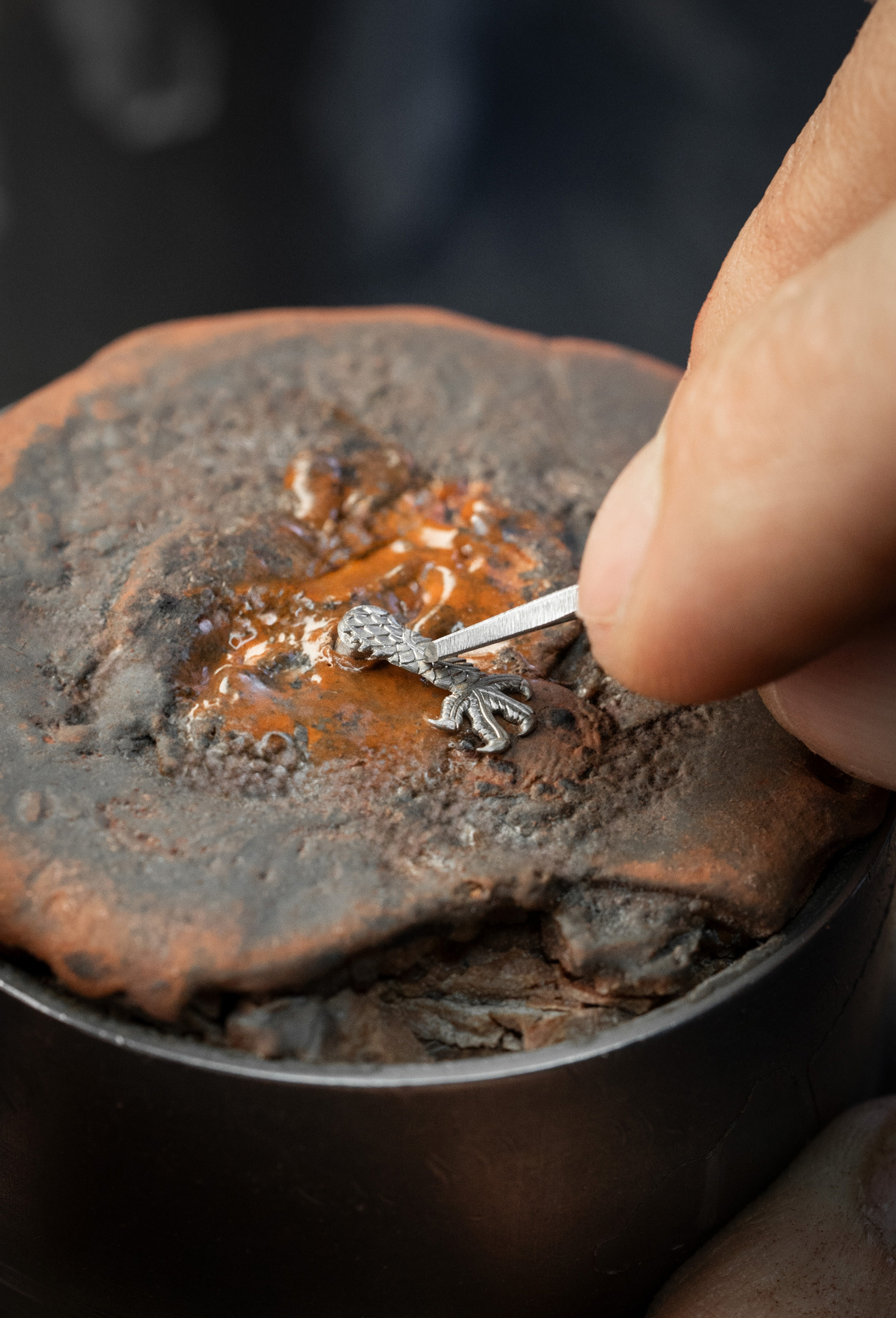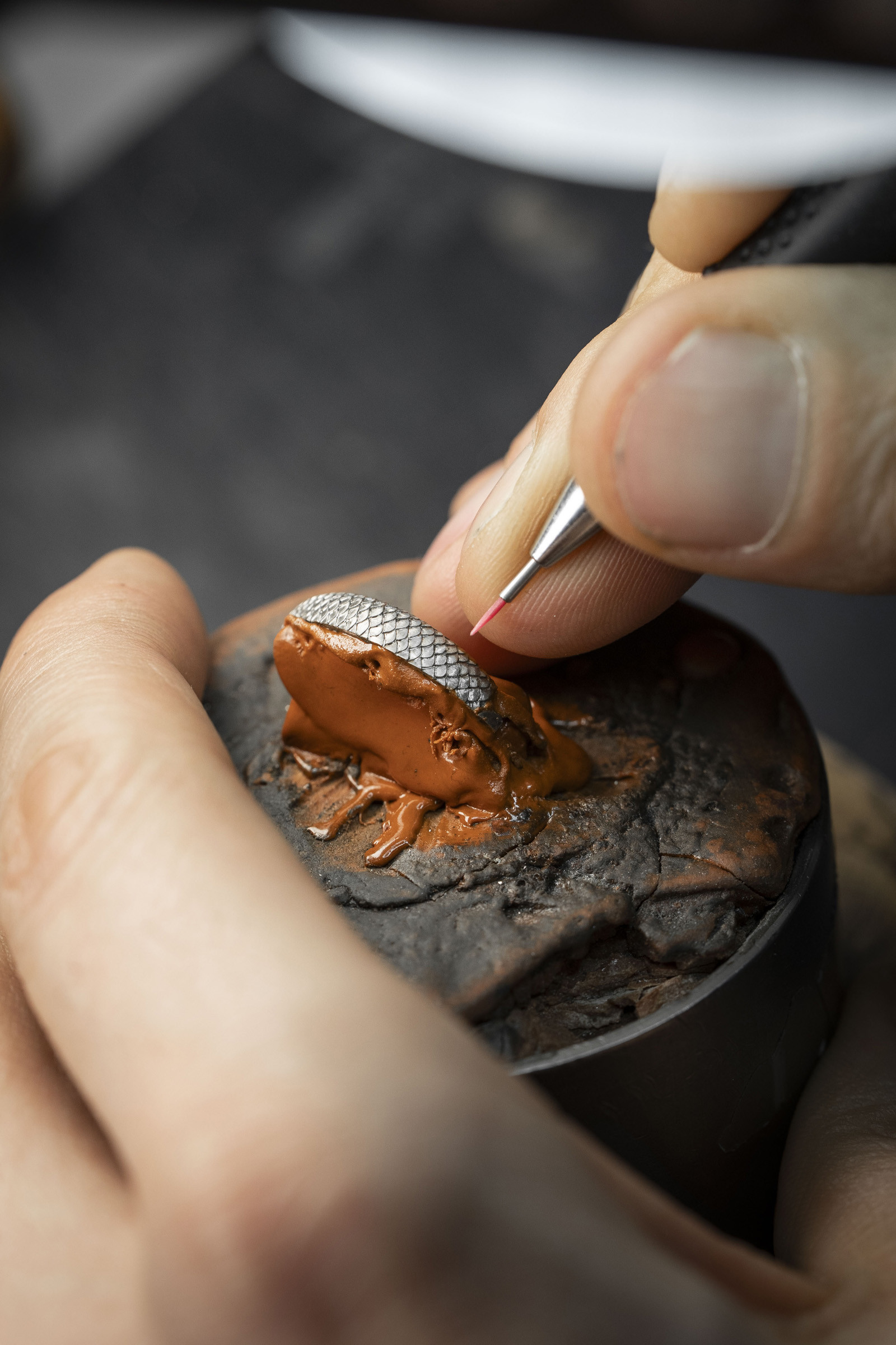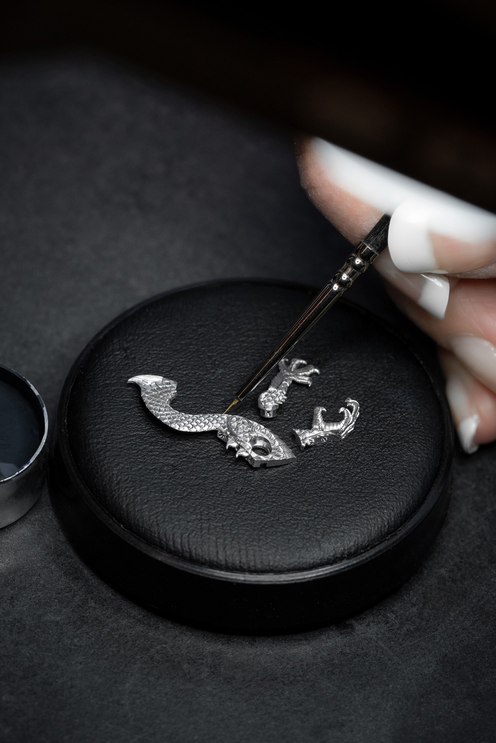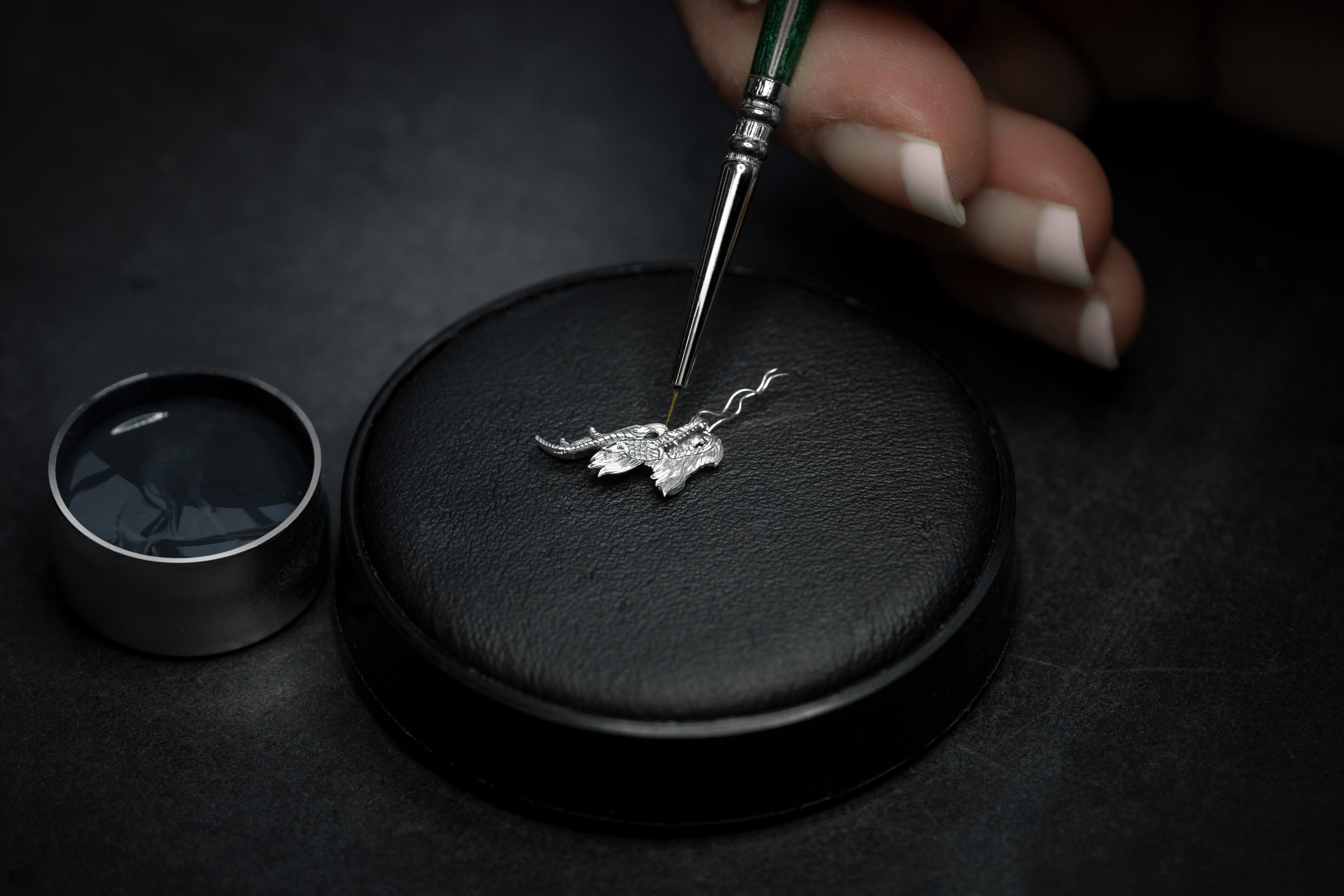 В данном случае заказчик выбрал опал насыщенного темно-синего цвета. Переливчатый блеск опала постоянно меняет картинку перед глазами и создает ощущение, что камень такой же живой, как и восседающий на нем дракон.