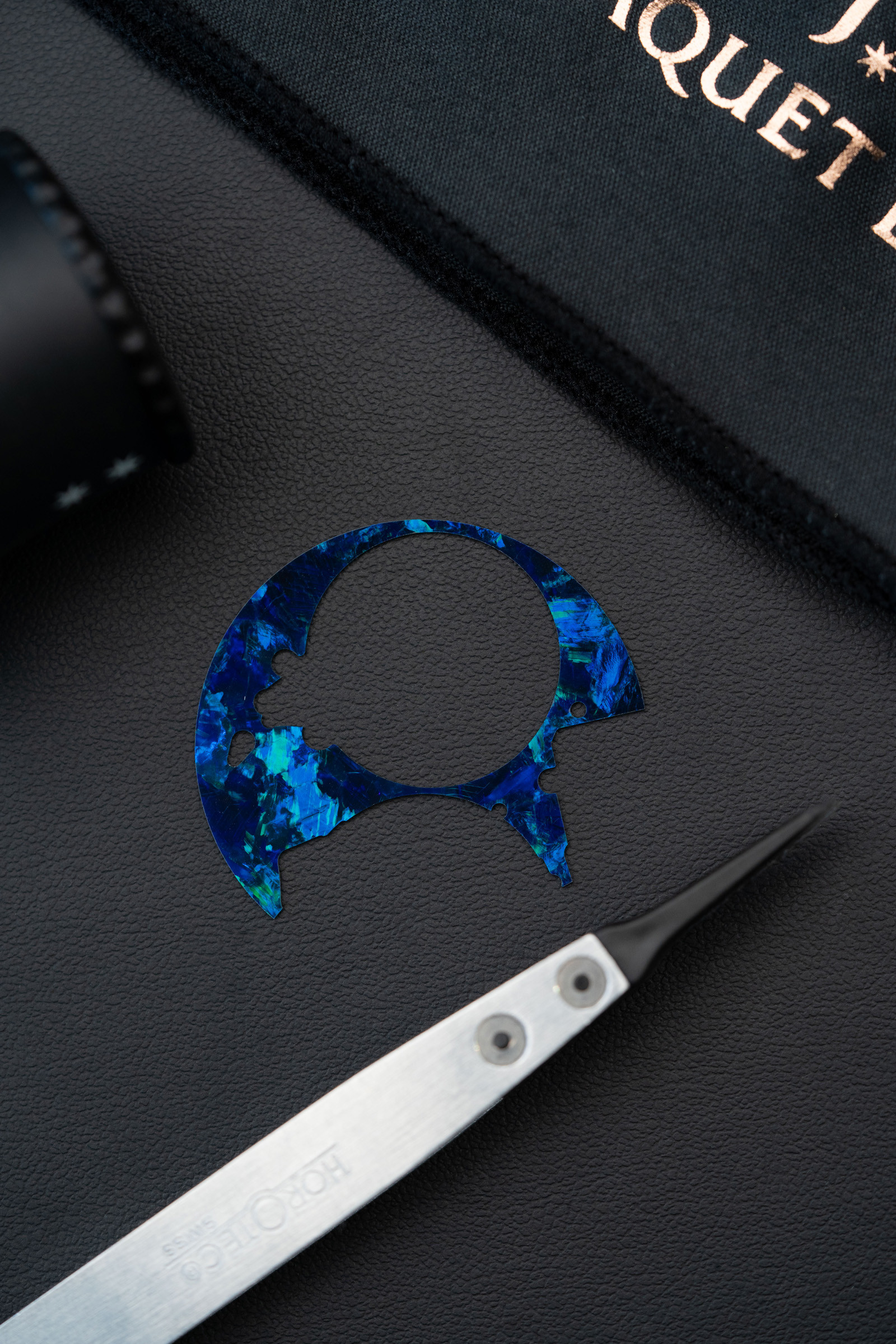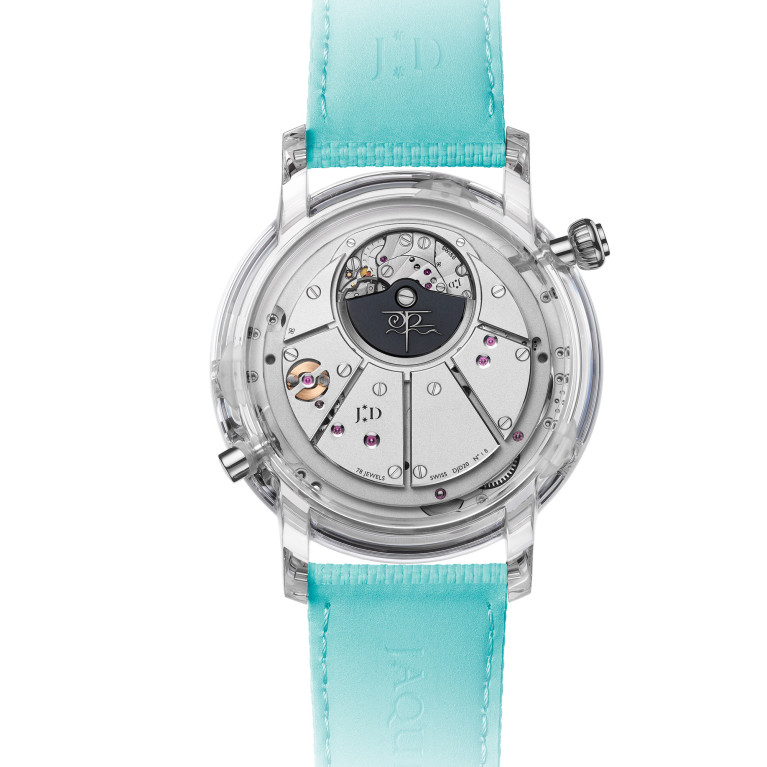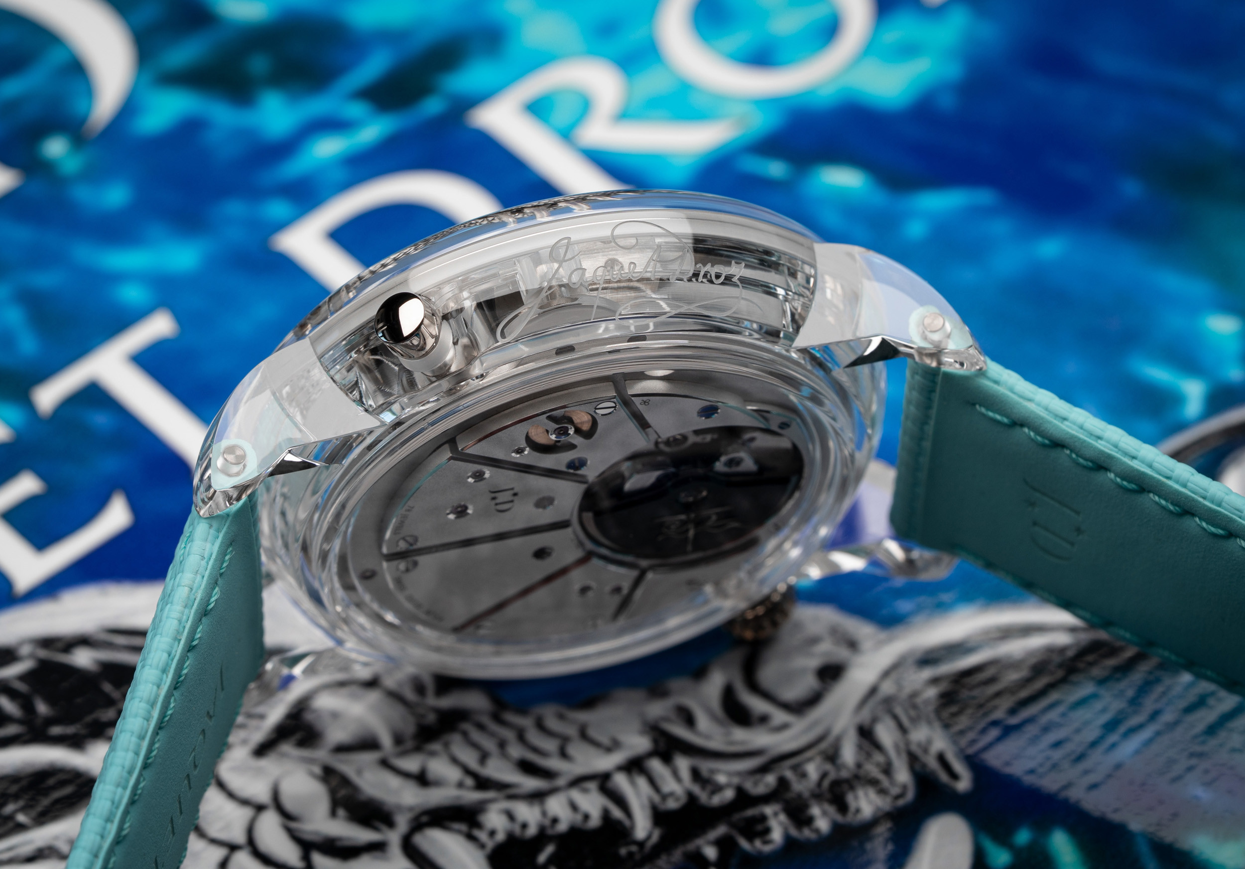 Первая – это выполненный на роторе автограф дизайнера Джона Хау (известен как создатель вселенной «Властелина колец»). Вторая – впервые воспроизведенная в часах подлинная рукописная подпись создателя бренда Пьера Жаке-Дро. Третья – надпись «Pièce Unique», указывающая на то, что часы созданы в единственном экземпляре. Последние две надписи впервые в истории Jaquet Droz выполнены лазером прямо на сапфировом корпусе модели.