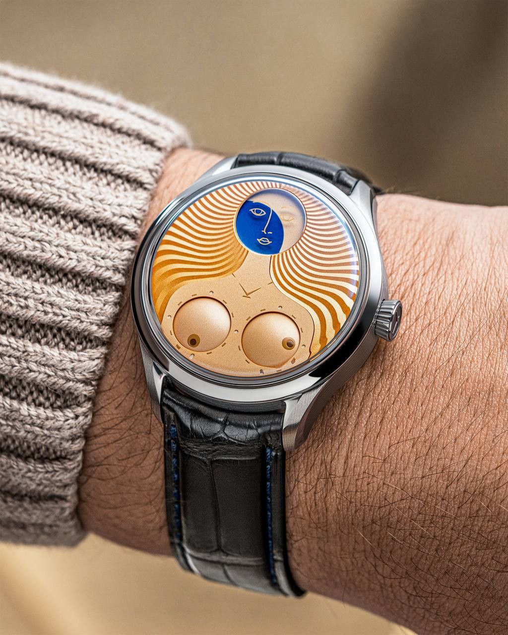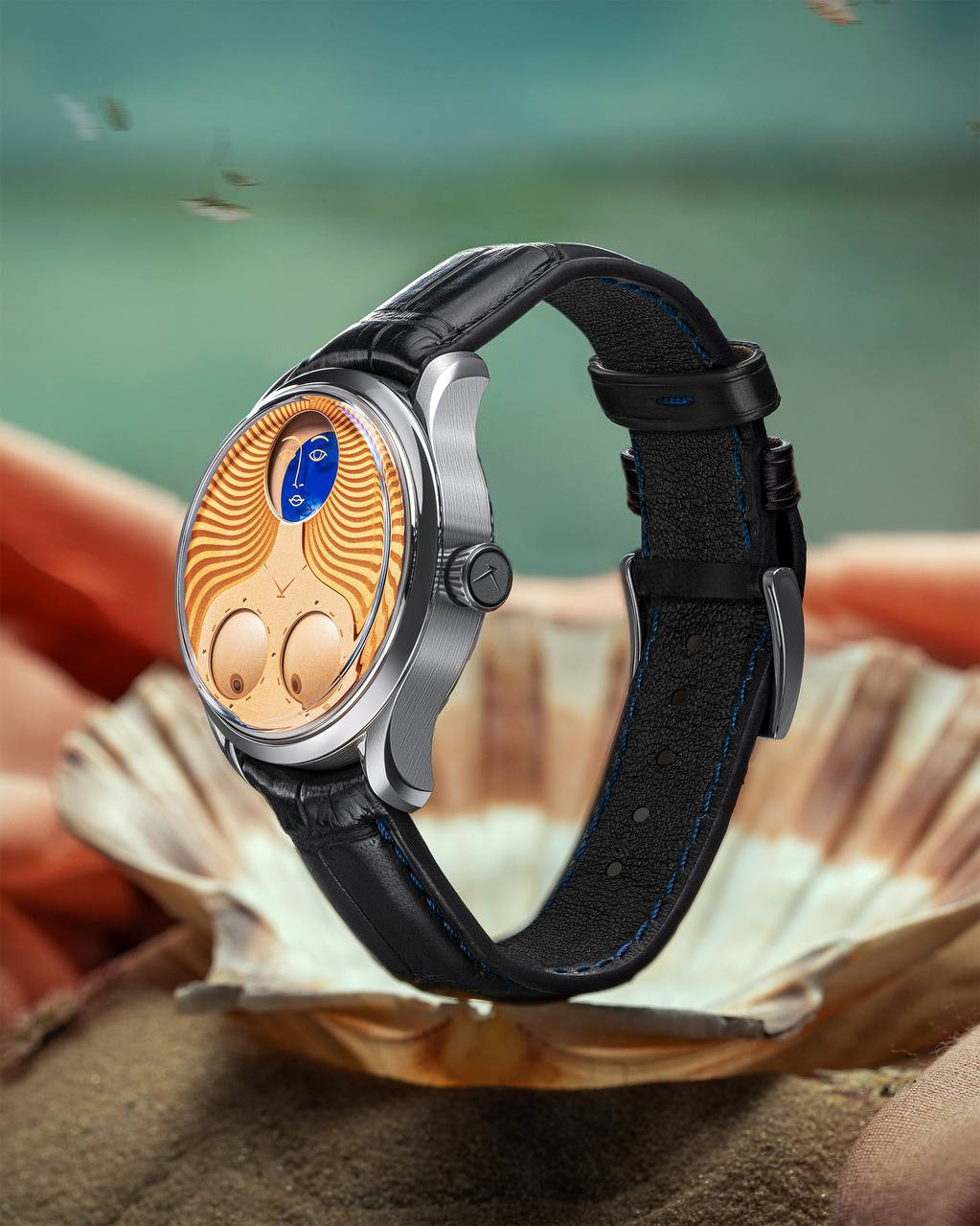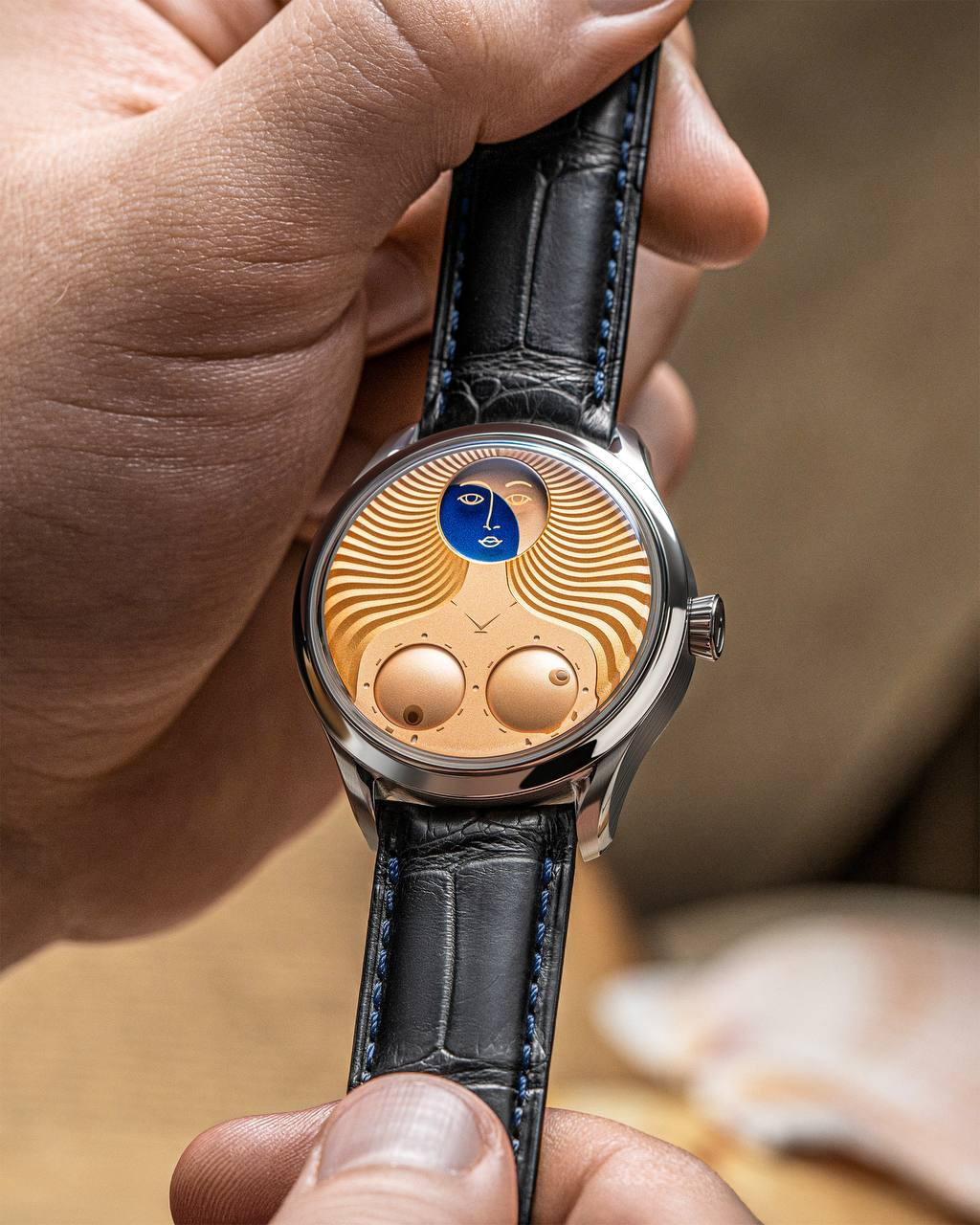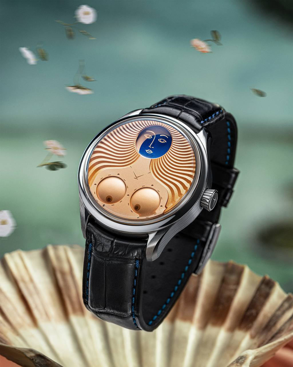 Пересматривая свои архивные наброски, часовщик вспомнил про свою идею сделать сферический «лунник» центром композиции, но отказался от этой затеи в ее изначальном виде. Была Матрешка – стала Венера. Вместе с богиней любви, плодородия и процветания в серии ристмонов появился контент 18+.