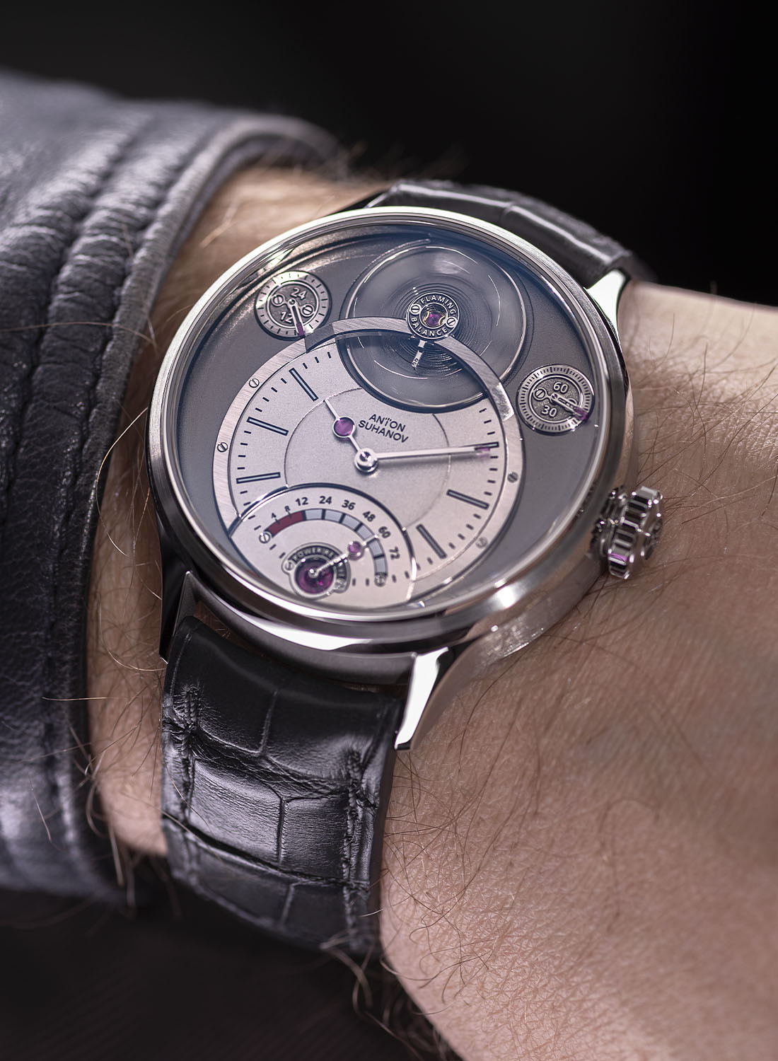 Новинка от Антона Суханова интересна по 3 причинам. Это впервые реализованный в наручных часах «пылающий баланс», оригинальный дизайн мануфактурного механизма с множеством отсылок к родному для мастера Санкт-Петербургу и не менее оригинальный индикатор запаса хода. Когда стрелка переходит в красную зону индикатора, которая соответствует 12 последним часам работы, она начинает двигаться вдвое быстрее.