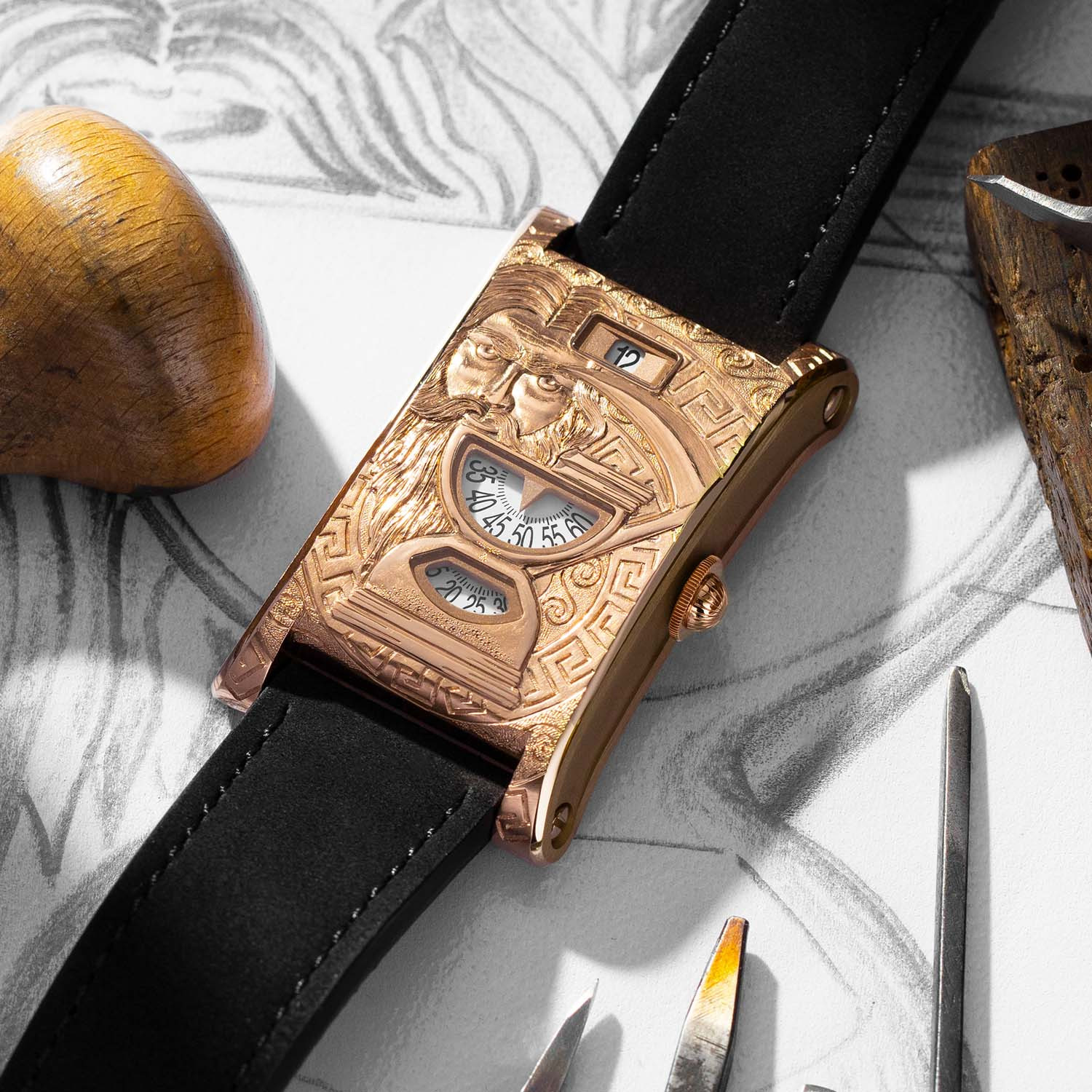 Изюминка этой модели – ручная гравировка с изображением древнегреческого бога времени. Корпус часов 48 х 30 х 9,7 мм изготовлен из красного золота. Показания на циферблате (часы, минуты, секунды) читаются сверху вниз. Работу модели обеспечивает механизм с ручным подзаводом (база – калибр Peseux), оснащенный 48-часовым запасом хода.