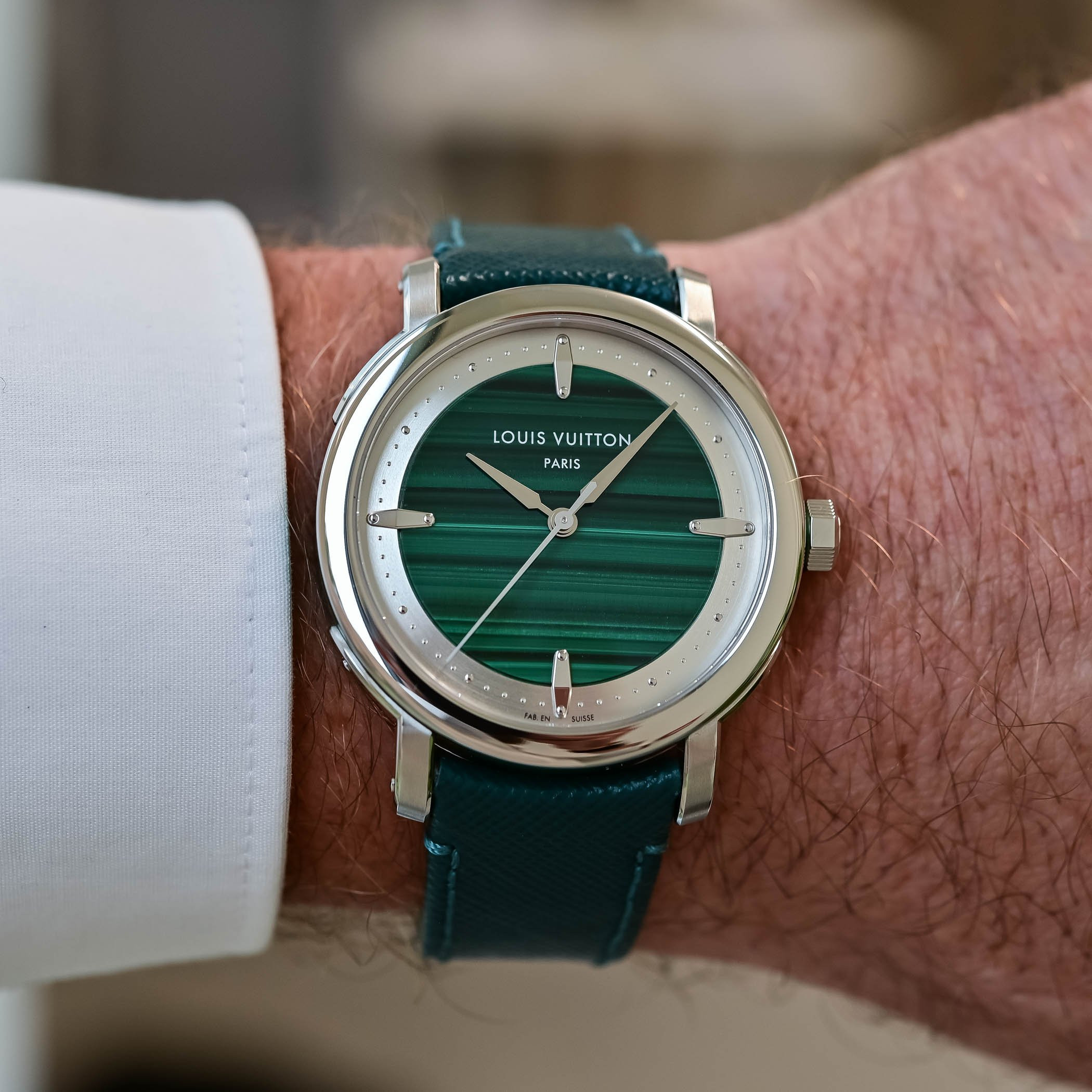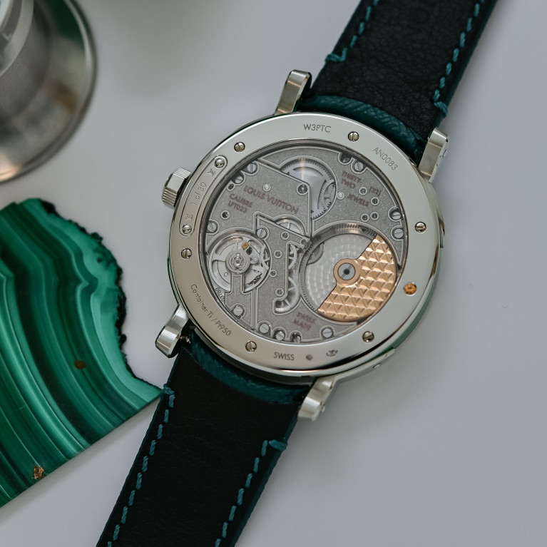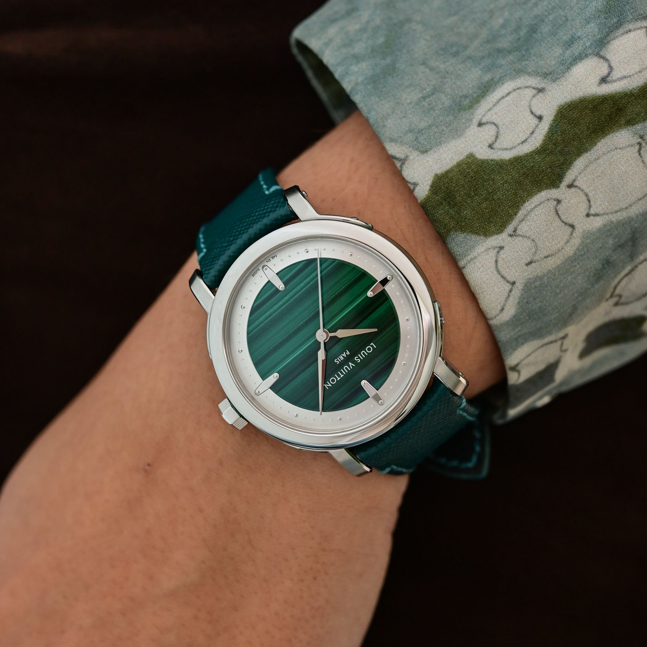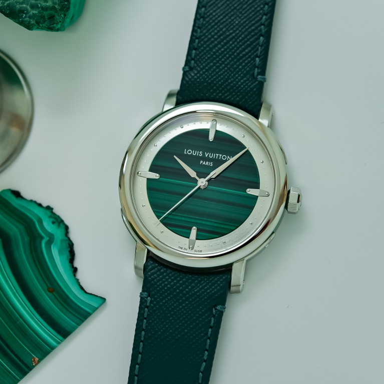 Каменный циферблат в новинках обрамляет сатинированное кольцо минутной шкалы с метками из белого золота. В четырех ключевых точках метки представлены массивными заклепками, которые тоже можно считать отсылкой к чемоданам Louis Vuitton. Часовая и минутная стрелки в стиле dauphine изготовлены из белого золота, а вот центральную стрелку решили сделать из титана.