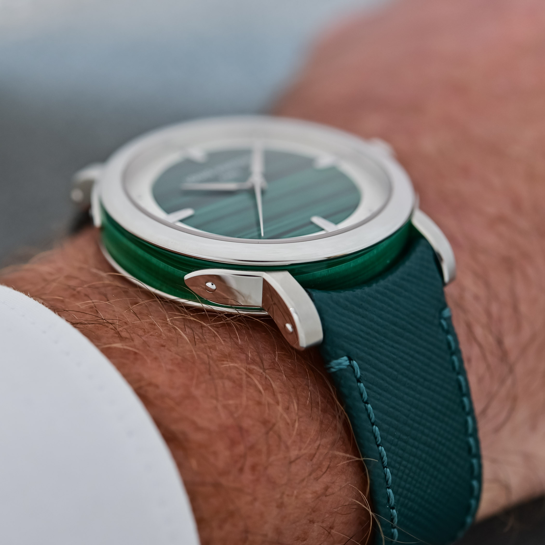 Модель с бирюзовым циферблатом предлагается носить на сером ремешке из сафьяновой кожи (мягкая козья или овечья кожа специальной выделки). Модель с циферблатом из малахита комплектуется таким же ремешком зеленого цвета. Ориентировочная стоимость часов составляет €65,000.