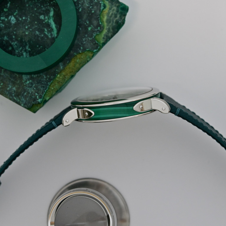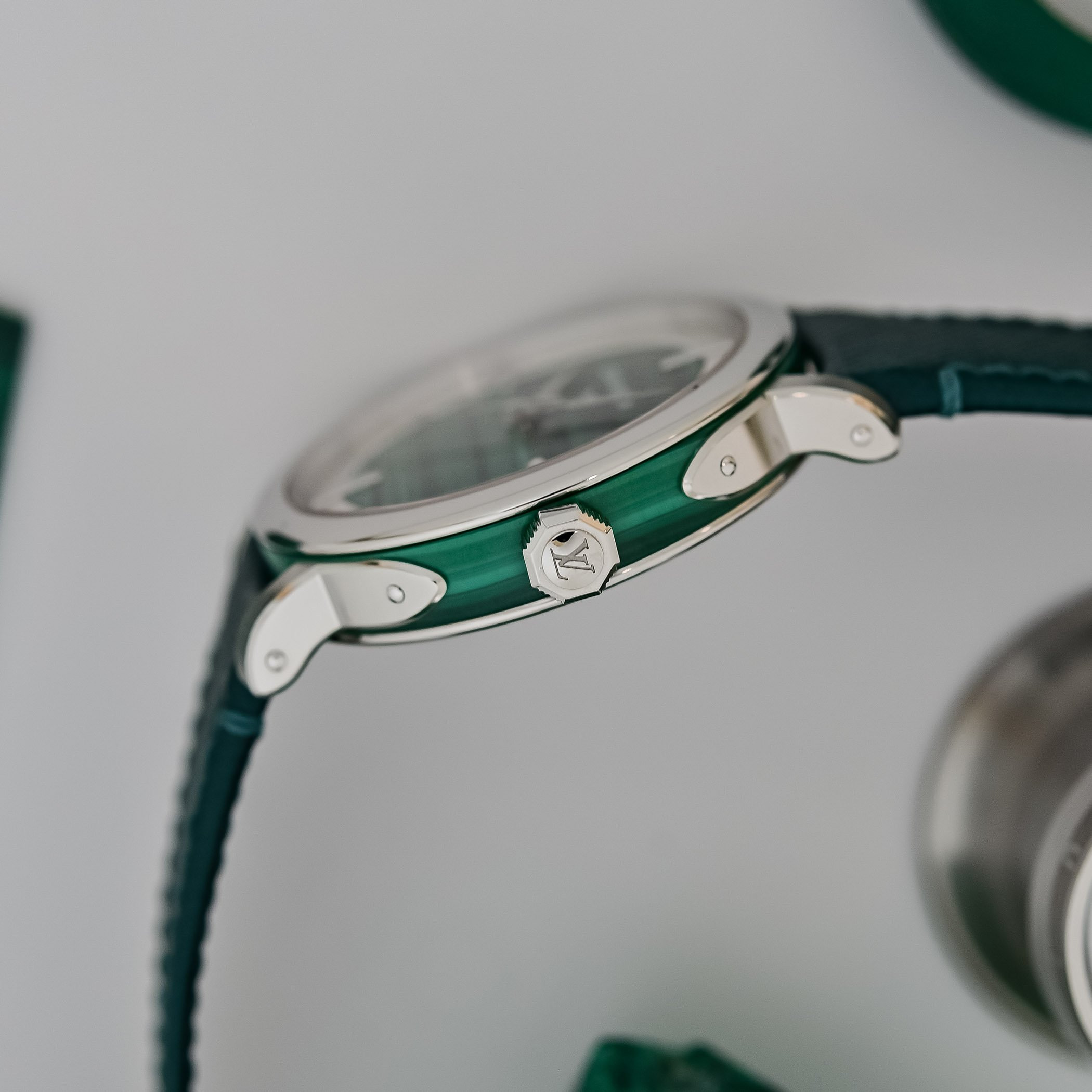 Обе новинки получили корпуса диаметром 40 мм, что всего на 1 мм больше, чем у обычных моделей Escale. Поскольку ни малахит, ни бирюза не отличаются особой твердостью, в работе с ними требуется предельная осторожность. Декоративные вставки в боковых частях корпуса защищают необычные ушки, которые напоминают латунные кронштейны в знаменитых чемоданах Louis Vuitton. Эту же функцию берут на себя платиновый безель и задняя крышка часов.