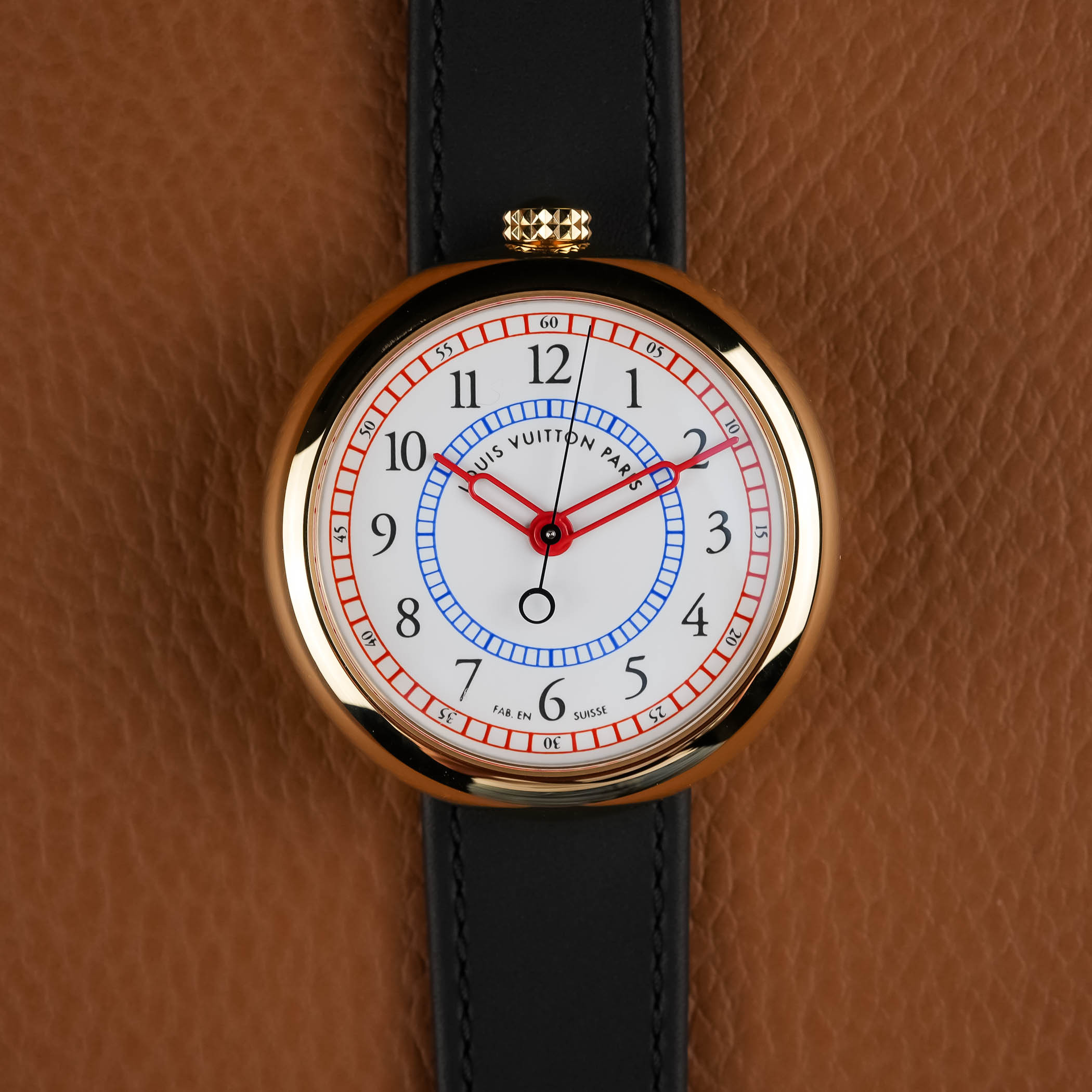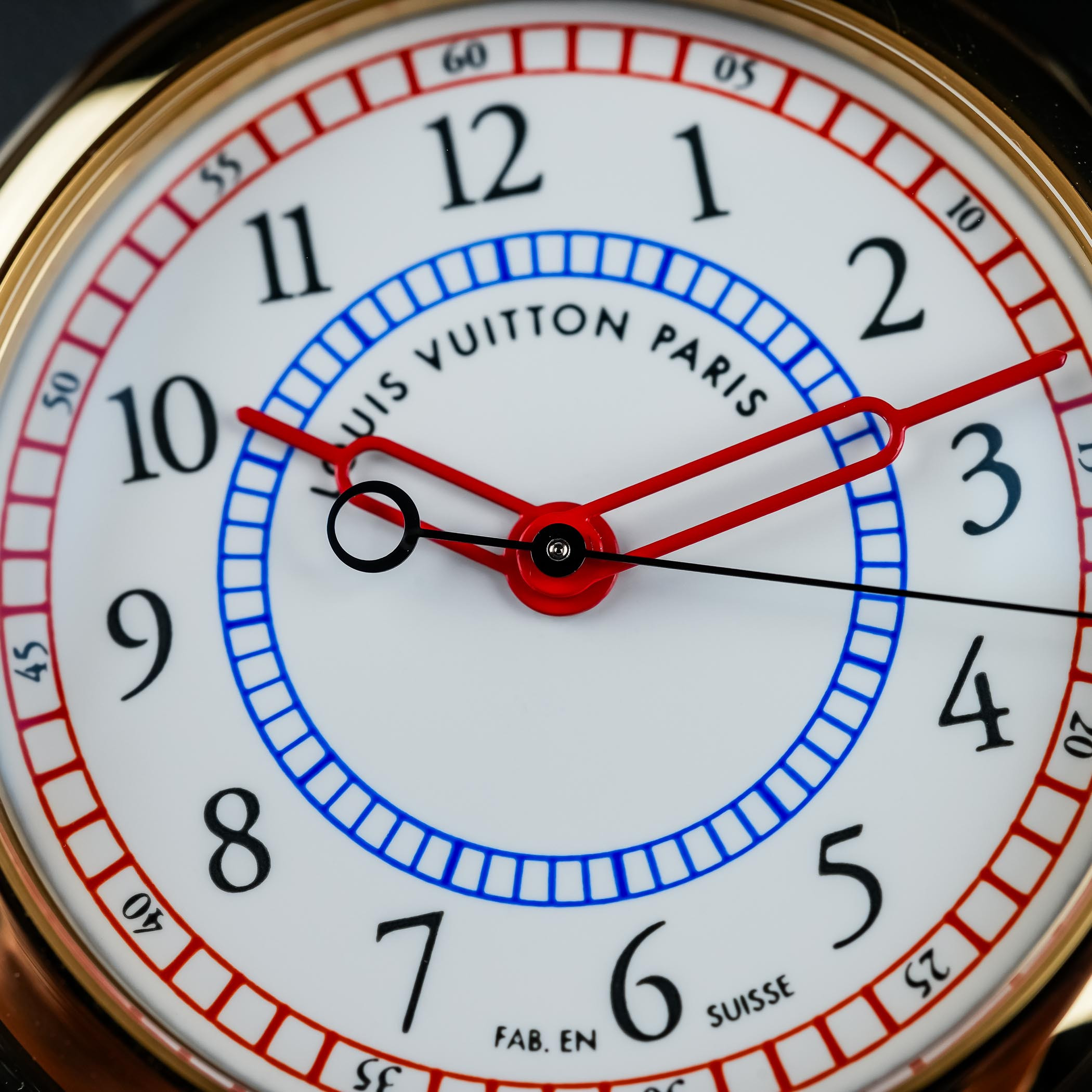 Интересная деталь: для каждого из трех цветов эмали требуется 8 сеансов нанесения (штамповки) с последующим обжигом в печи. Необычные стрелки-шприцы здесь покрыты красным лаком, а секундная стрелка изготовлена из вороненой стали.