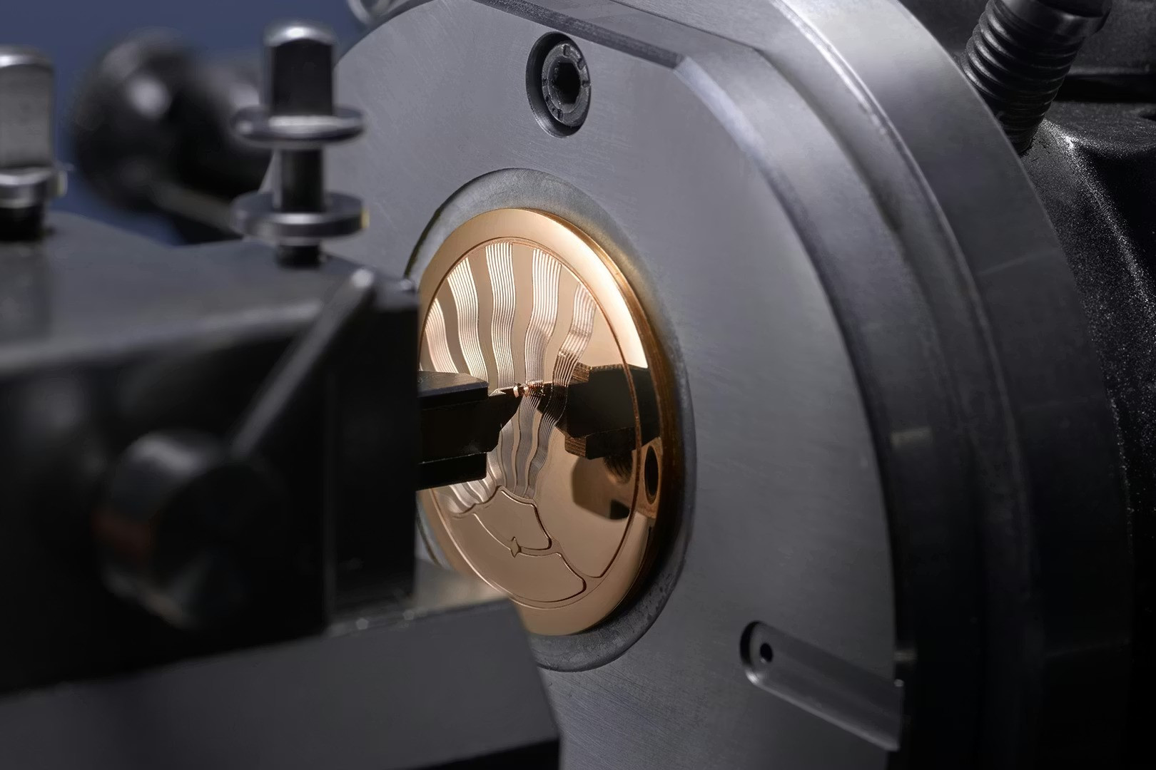 Еще одна изюминка новинки – серия волнообразных лучей, которые расходятся от окошек по всей поверхности циферблата. Выполняются они с помощью двух станков с ручным управлением: один из них 1850 года выпуска нужен для гравировки концентрических волн и прямых линий, другой, выпущенный в 1935 году, используется для нанесения волнообразного рисунка. На гравировку одной модели из этой серии уходит около 16 часов.
