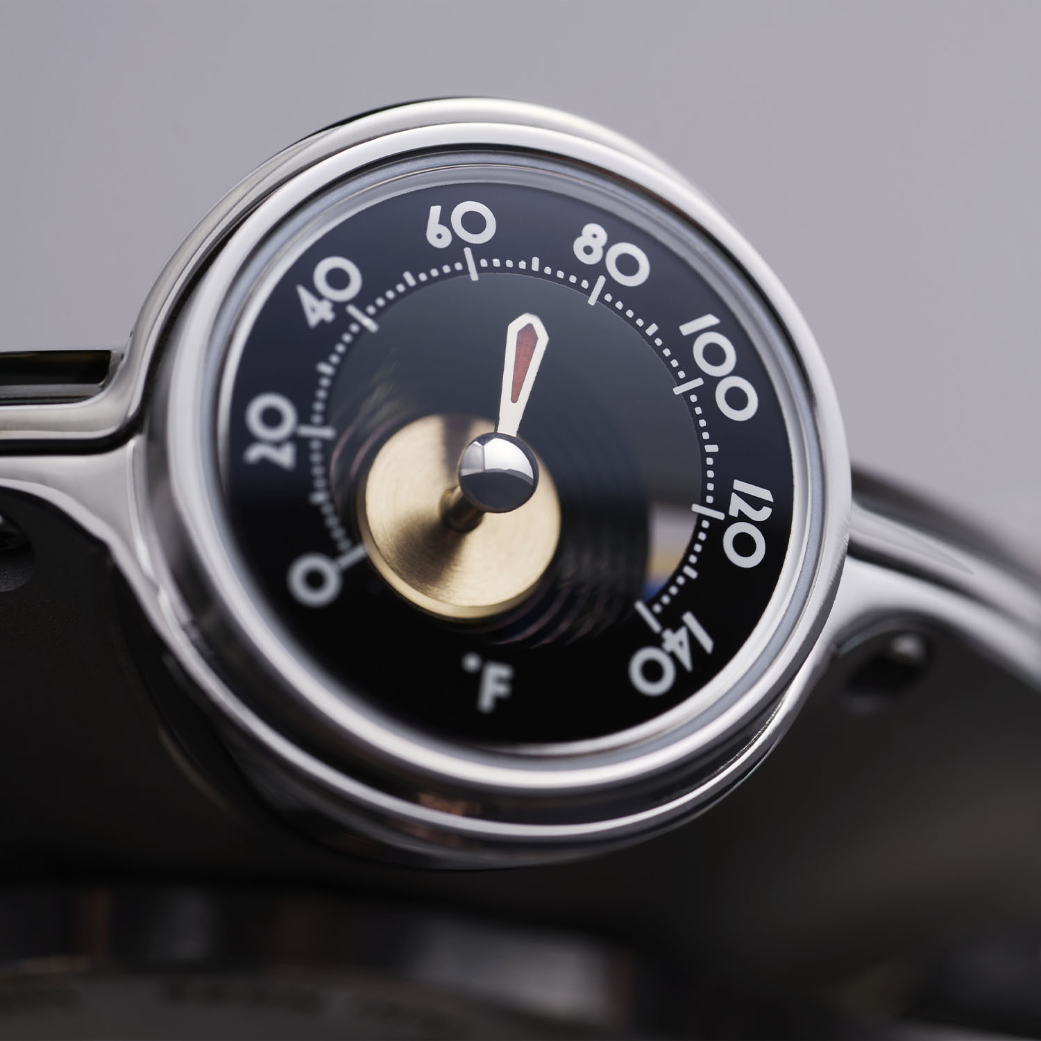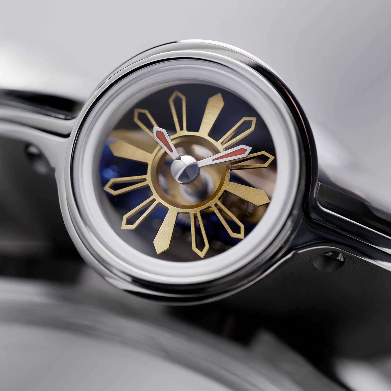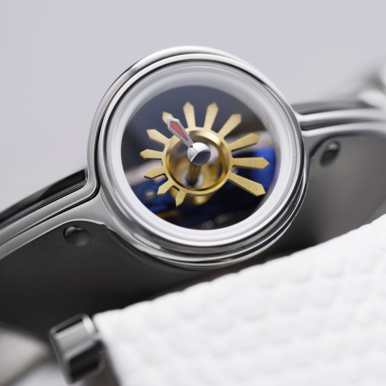 Последнее решение легло в основу оригинальной системы подзавода: каждый поворот корпуса на 45° по часовой стрелке добавляет ровно 72 минуты к запасу хода. Часы максимально ориентированы на ежедневное использование. За эргономичность здесь отвечают изогнутые ушки, которые служат креплениями для ремешка и вместе с тем распределяют нагрузку и стабилизируют часы во время вращения корпуса. Водонепроницаемость всего 20 метров, т.е. перед нами именно «дом на запястье», но никак не яхта.