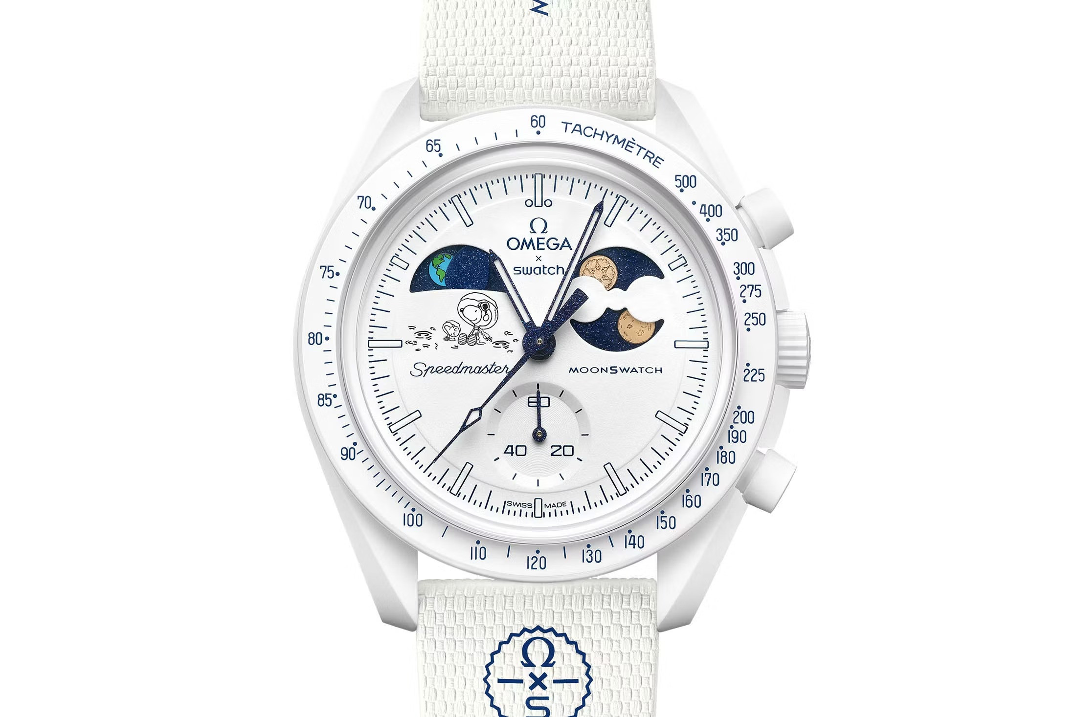 Часы привлекают инверсией привычной для Moonswatch цветовой палитры. Вместо синего корпуса с белыми акцентами в дизайне, здесь представлен корпус из белой биокерамики с вкраплениями синего цвета.