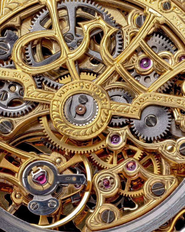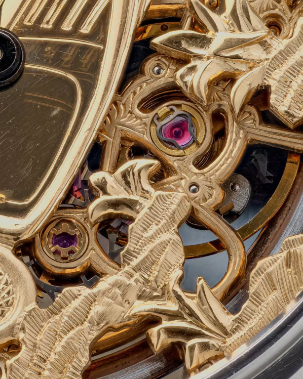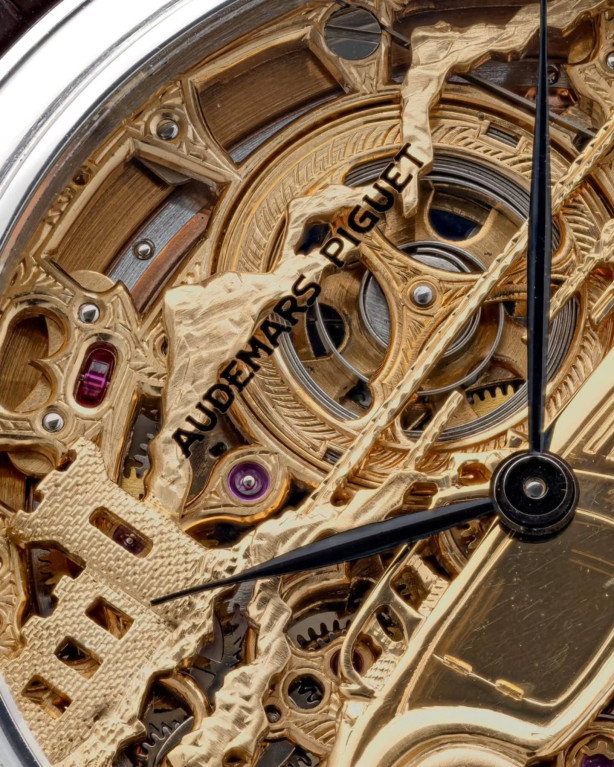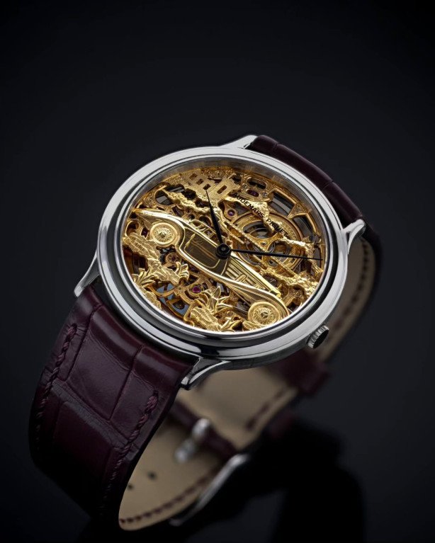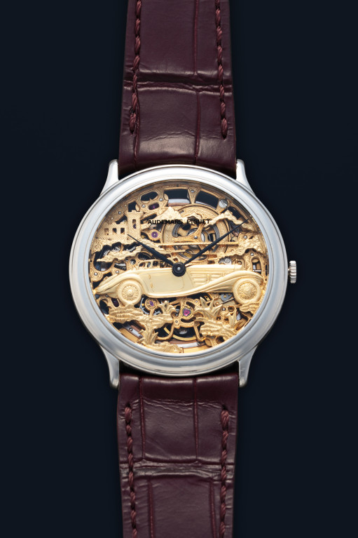 В переплетениях мостов на открытом для обзора механизме можно увидеть винтажный родстер Mercedes Benz 500K 1930-х годов выпуска. Искусно выполненную гравировку дополняют черные стрелки в форме листьев и надпись «Audemars Piguet», сделанная на внутренней стороне стекла.