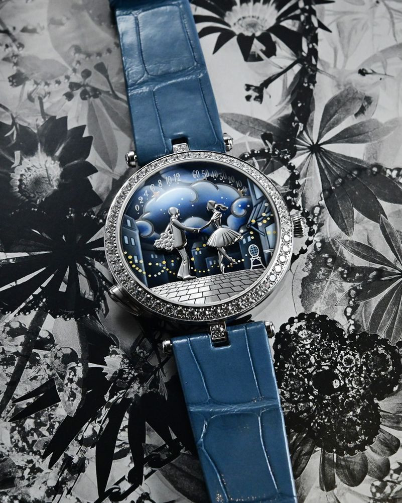 Чтобы не мешать влюбленным, часовую и минутную шкалы разместили над облаками в верхней части циферблата. Роль стрелок здесь выполняют выплывающие из облаков звезды. Часы представлены в 38-миллиметровом корпусе из белого золота. На разработку установленного в корпус механизма с ручным подзаводом и 36-часовым запасом хода ушло 4 года. Сложную задумку с двумя автоматонами идеально дополняет эмаль в технике гризайль. Ориентировочная стоимость модели составляет CHF 142,000.